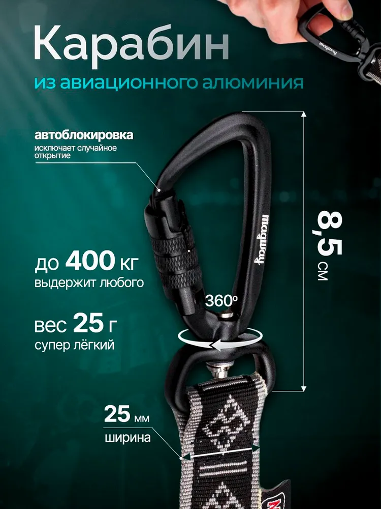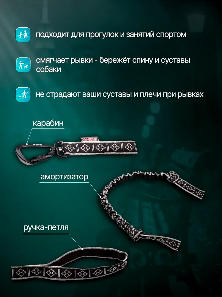 Потяг MagWay — для байкджоринга, каникросса и прогулок с велоудочкой.Потяг MagWay для байкджоринга, каникросса и прогулок с велоудочкой — обязательный элемент снаряжения для безопасной и комфортной езды с собакой на велосипеде. Подходит для спортивных стартов, активных тренировок и неспешных велопрогулок.Изготовлен из износостойкой 25-мм полипропиленовой стропы рукавного типа. Лёгкий, но надёжный — прослужит не один сезон.Встроенный амортизатор гасит рывки, снижая нагрузку на спину собаки и ваши руки — особенно важно при езде с велоудочкой или спрингером, когда скорость выше.Алюминиевый карабин с одной стороны и удобная петля с другой позволяют крепить потяг к ездовой шлейке, велоудочке MagWay или другим моделям, поясу для бега, саням или самокату.Две длины:— 2 м (для каникросса и догтреккинга)— 2,8 м (для байкджоринга в паре с велоудочкой)Как использовать потяг с велоудочкой:Для безопасной езды на велосипеде с собакой потяг MagWay крепится одним концом к шлейке собаки, а другим — к велоудочке (спрингеру) или напрямую к раме велосипеда.Велоудочка удерживает потяг на расстоянии от колеса и предотвращает запутывание, а амортизатор сглаживает резкие рывки.Совместим с велоудочками MagWay и любыми стандартными моделями спрингеров.Зачем нужны узлы на потяге?Они фиксируют амортизирующий фрагмент. Развязывать нельзя — это нарушит работу амортизатора.Длина в ненагруженном состоянии:— 2 м: ~165 см, включая карабин— 2,8 м: ~230 см, включая карабинMagWay — надёжный выбор для байкджоринга, каникросса и прогулок с велоудочкой или спрингером. Обеспечивает безопасность, комфорт и долгий срок службы при любых погодных условиях.Потяг MagWay подходит для байкджоринга, каникросса, догтреккинга, скиджоринга и прогулок с велоудочкой или спрингером. Он совместим с велоудочками MagWay и другими моделями, снижает нагрузку на собаку при рывках и предотвращает запутывание поводка при езде на велосипеде.