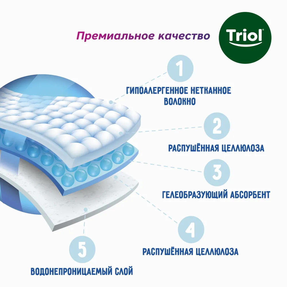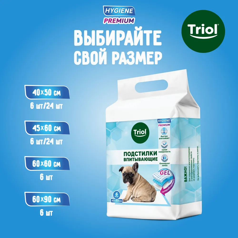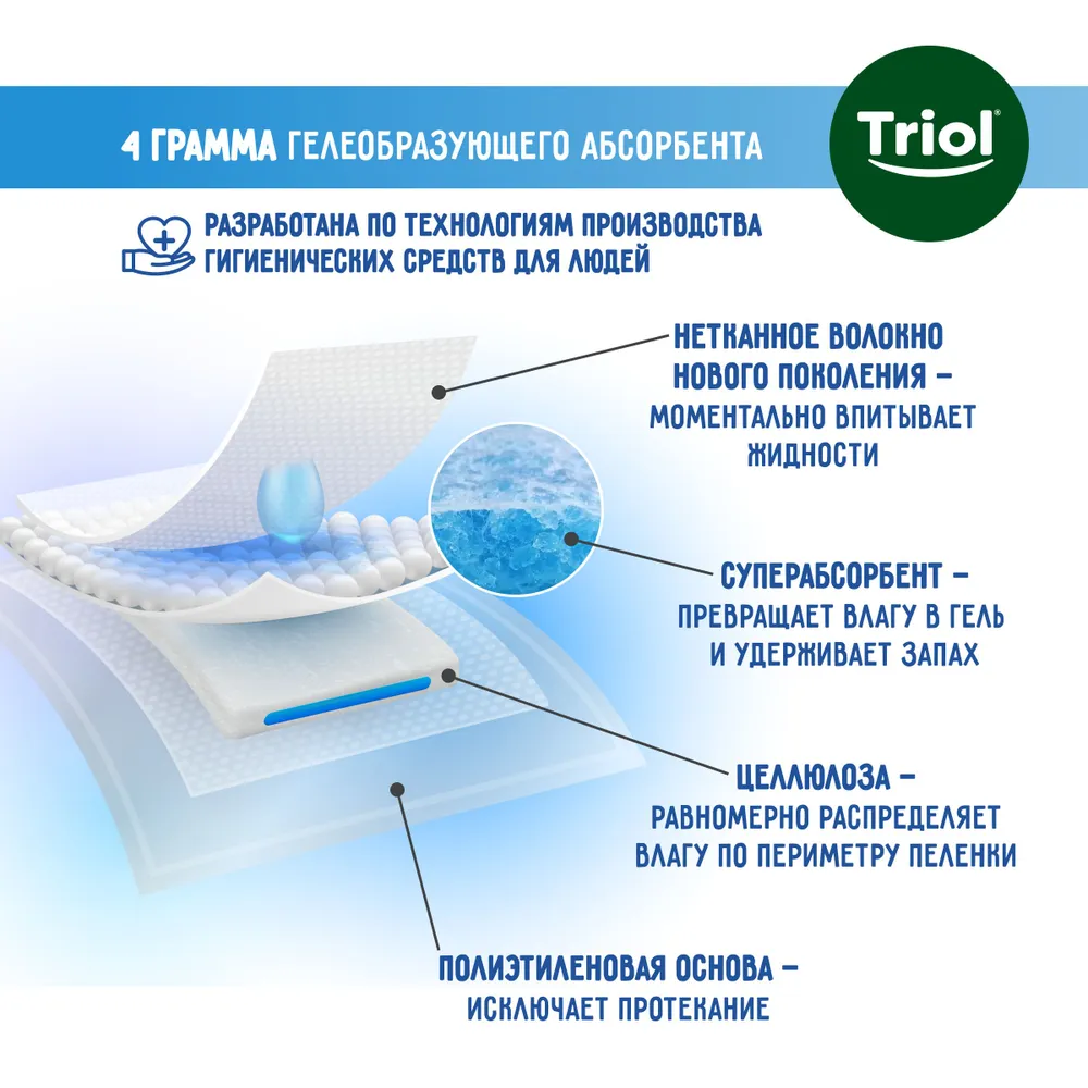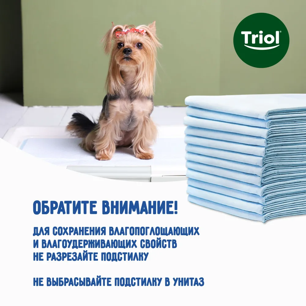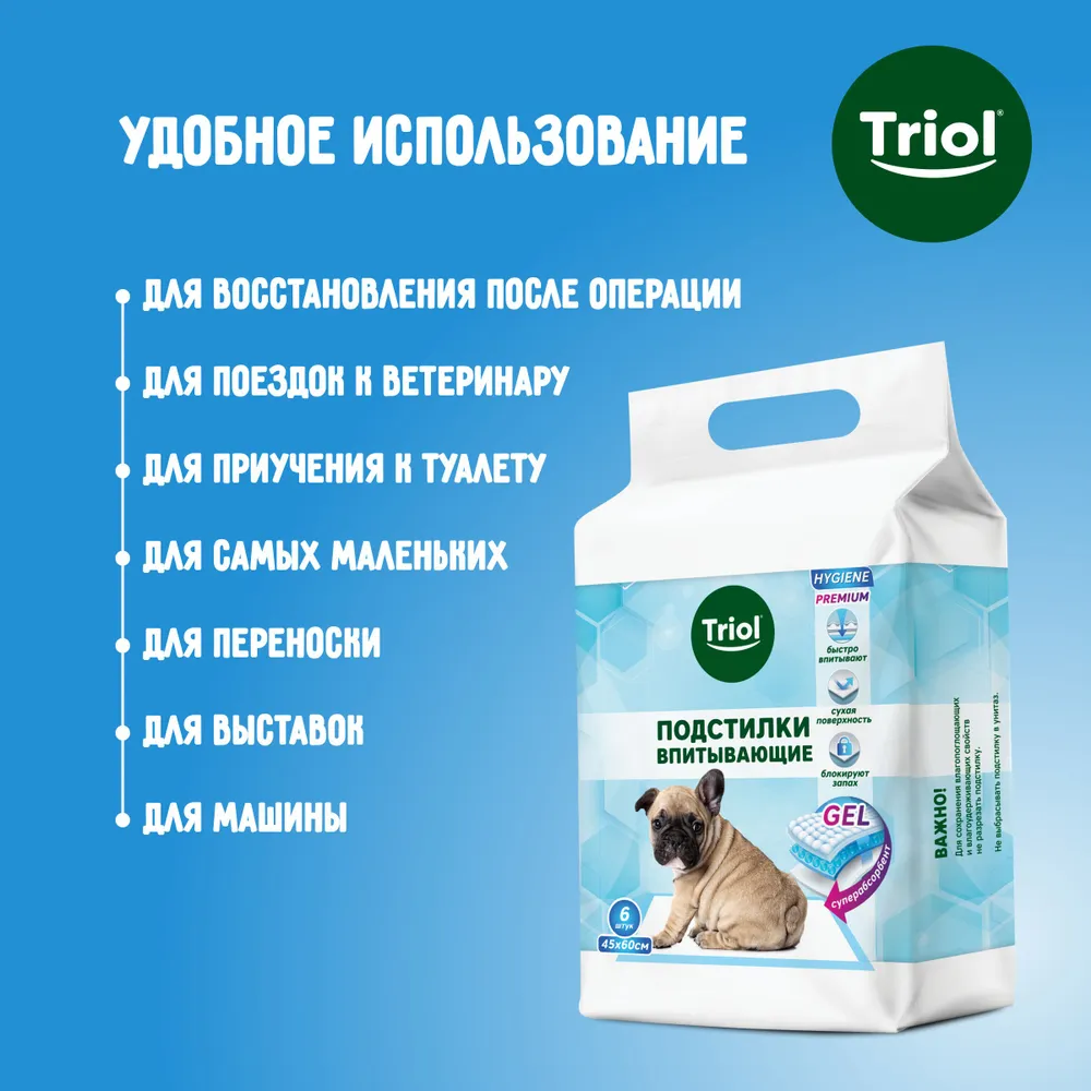 TRIOLПодстилки для животных незаменимы во время путешествий, участия в выставках, визита к ветеринару, приучения питомца к туалету, в послеоперационный период. Гигиенические одноразовые подстилки для домашних животных изготовлены из нежного, приятного на ощупь гипоаллергенного нетканого волокна, целлюлозы и гелеобразующего абсорбента.Продукт не токсичен, не вызывает аллергии. Надежно удерживают влагу и запах, исключают протекание жидкости. Способ применения: поместить подстилку в нужное место (на пол, в переноску, в туалет). После использования заменить на новую. Важно! Для сохранения влагопоглощающих и влагоудерживающих свойств не разрезать подстилку. Не выбрасывать в унитаз. В упаковке 6штук. Размер 45*60см.