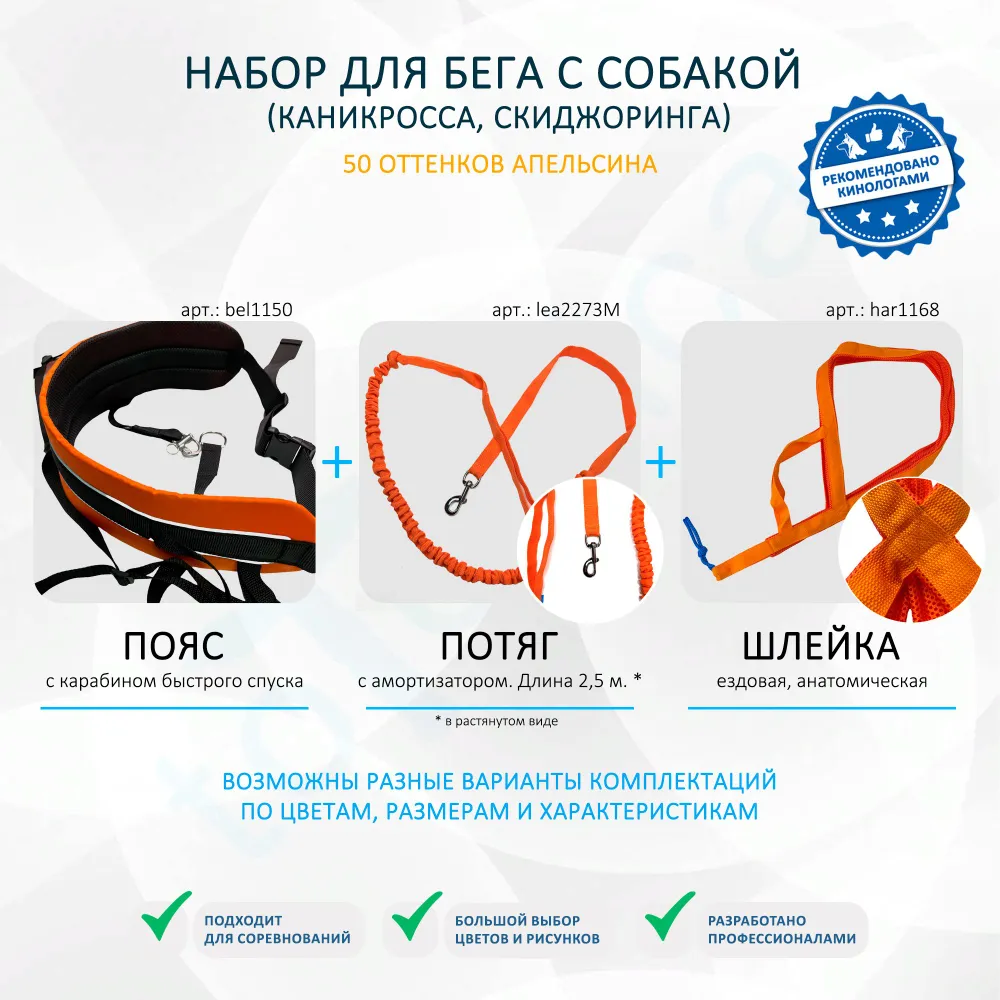 Набор для бега с собакой (каникросс). Пояс с карабином быстрого спуска, потяг с амортизатором 2,5 м, ездовая шлейка XL