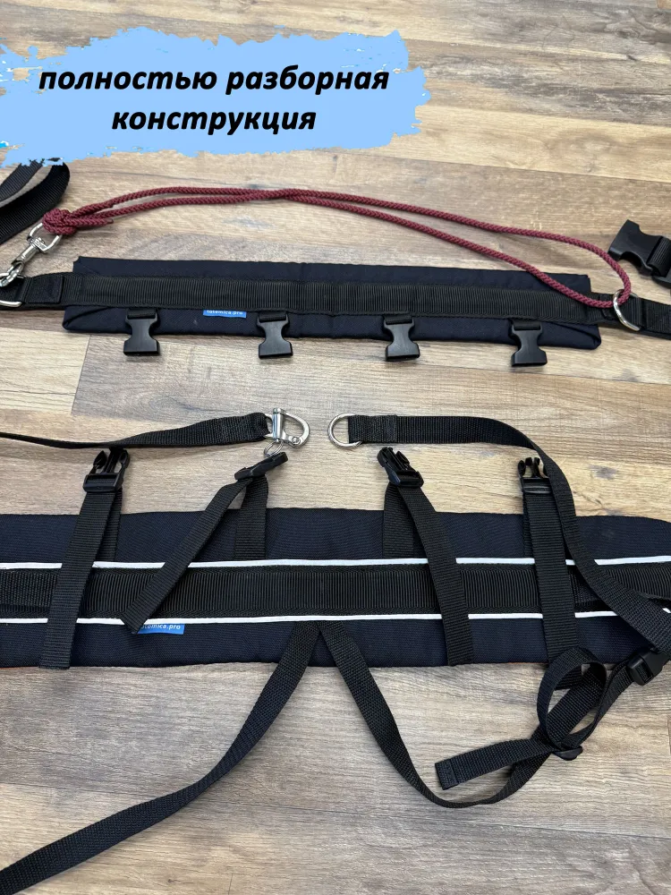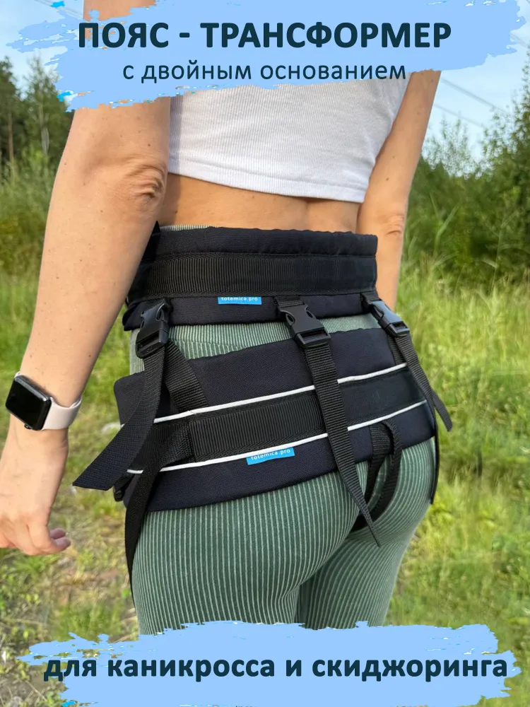 Пояс-трансформер для каникросса и прогулок с собакой.Многофункциональный пояс-трансформер, разработанный специально для активных прогулок и занятий ездовыми видами спорта с собакой.Состоит из двух частей: основной и дополнительной, которые можно использовать как вместе, так и по отдельности в зависимости от задач.* В сборном виде пояс обеспечивает надежную поддержку поясницы, равномерно распределяя нагрузку и снижая давление на спину — идеально для каникросса, скиджоринга и других активностей.* Основная часть — компактная и удобная, подходит для тренировок и соревнований. Соответствует требованиям ездового спорта.* Дополнительная часть — легкая и негромоздкая, идеально подходит для повседневных прогулок с собакой.Карабин быстрого спуска гарантирует безопасность даже начинающему бегуну или лыжнику.В случае необходимости можно моментально отстегнуться от собаки, дернув за шнурок на карабине.Световозвращающие элементы обеспечат безопасность во время тренировок и соревнований в вечернее время.Пояс быстро адаптируется под нужды владельца, позволяя легко переключаться между спортивным режимом и прогулочным форматом. Отличный выбор для тех, кто ценит комфорт, надежность и универсальность в одном изделии.