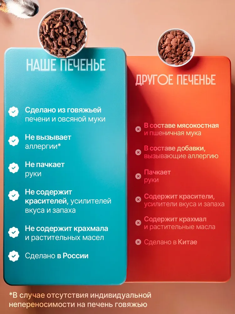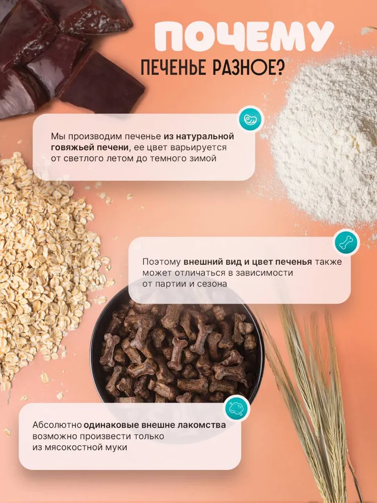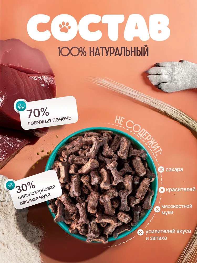 Наши вкусняшки для собак - это безопасное лакомство даже для самых маленьких щенят.Печенье для собак «Натуральные лакомства для собак» - это лакомство для собак мелких и крупных пород.Лакомство для собак имеет полностью натуральный состав. Это 70% говяжьей печени + 30% овсяной муки.Не пачкает руки и имеет приятный аромат печени
