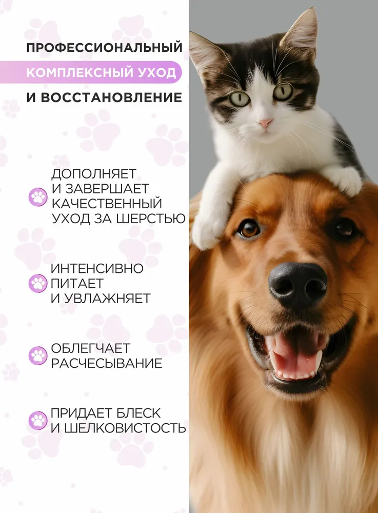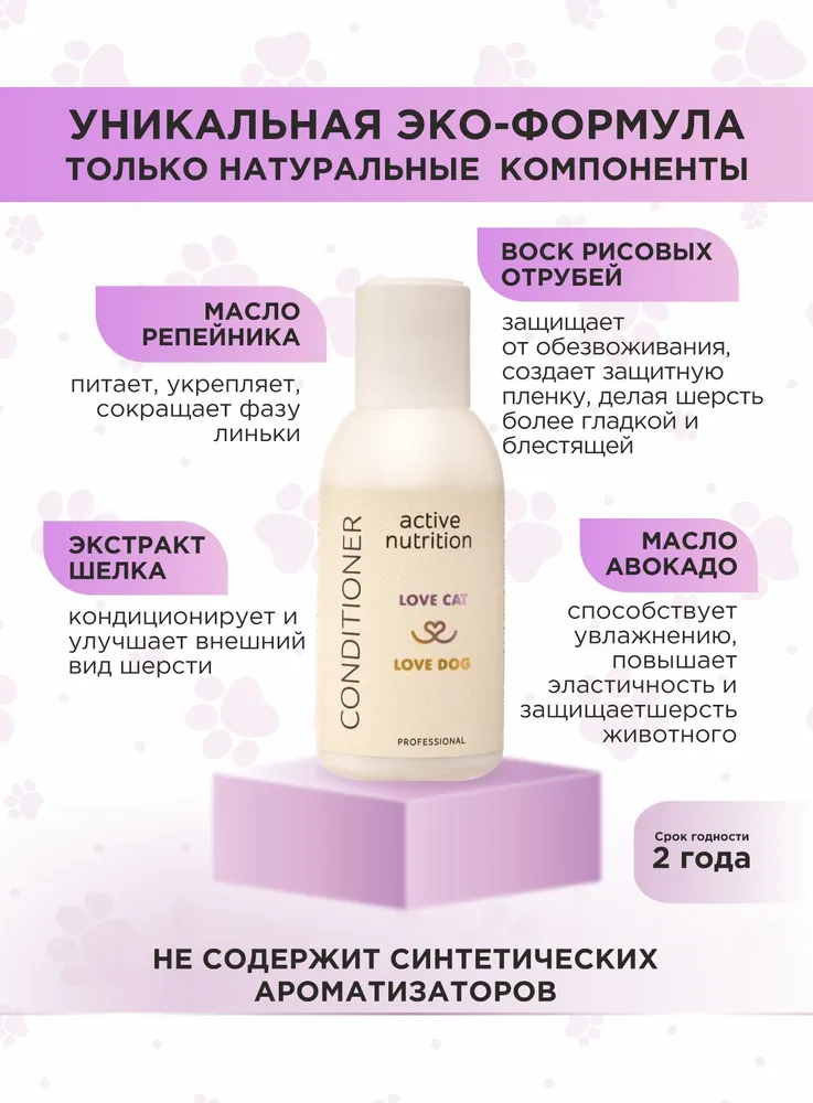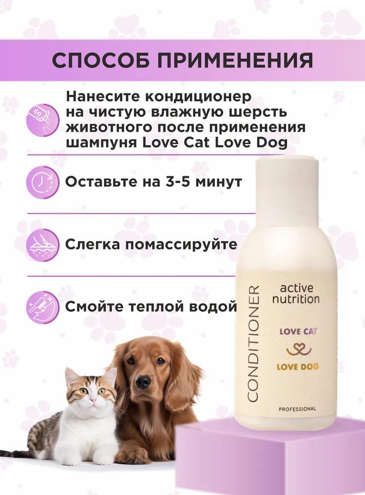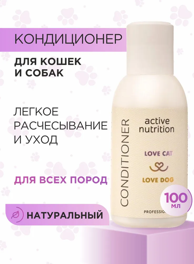 Станьте профессиональным грумером и стилистом для любимого питомца вместе с органической серией по уходу за собаками и кошками LOVE CAT LOVE DOG. Кондиционер для собак и кошек Активное питание помогает шерсти стать блестящей и шелковистой. Разглаживает каждый волосок, чтобы вычесывание питомца было простым и быстрым делом для вас.Мы разработали кондиционер для собак и шампунь для кошек, а также другие уникальные средства для ухода за животными с учетом опыта профессиональных грумеров и заводчиков.Органический кондиционер для собак и кошек заботится не только о шерсти, но и не повреждает кожу ваших рук, в отличие от обычных синтетических средств. Мы за безопасное и приятное купание для всех участников!Кондиционер отлично подходит для ухода за длинношерстными собаками или кошками.Масло репейника обладает питающим, укрепляющим эффектом, оказывает благоприятное действие на структуру волос животного, сокращает фазу линьки.Воск рисовых отрубей защищает шерсть собаки и кошки от обезвоживания, создает защитную пленку, делая шерстку более гладкой и блестящей.Экстракт шелка кондиционирует и улучшает внешний вид шерсти питомца.Масло авокадо способствует увлажнению, повышает эластичность и защищает шерсть животного от вредных воздействий окружающей среды.Даже если ваш любимый хвостик долгое время обходился без мытья, комплекс средств по уходу за собаками и кошками LOVE CAT LOVE DOG поможет выглядеть так, как будто он побывал в дорогом груминг-салоне. Здоровые, ухоженные на профессиональном уровне шерсть и кожа четвероногого друга - без лишних трат и поездок. И всё это в привычных домашних условиях, никаких переживаний и стресса!Рекомендации по уходу:Обработайте засаленные, жирные, особо грязные участки шерсти Пастой для сильно загрязненных шерсти и кожи. Обратите пристальное внимание на пробор хвоста, зону за ушами, под глазами животного.Пока паста растворяет загрязнения, распределите Гель-пасту для обновления цвета и структуры волоса по всей шерсти. Хорошо помассируйте.Смойте пасту и гель с шерсти. Нанесите подходящий Шампунь для собак и кошек или Шампунь-концентрат из нашей линейки: для Глубокого очищения, для Деликатного очищения, для Шикарного объема, для Особого блеска, для Жесткой шерсти.Помассируйте всё тело животного. Рекомендуем сначала вспенить шампунь губкой. Тщательно промойте шерсть.Завершите уход кондиционером для кошек и собак или маской, в зависимости от потребностей шерсти вашего питомца. Усилит полученный результат Спрей-сыворотка.Мы гарантируем:растительные, натуральные ароматы наших продуктов нейтрализует неприятный запах шерсти;оптимальный именно для вас объем от 100 мл до 10 л для домашнего и профессионального использования;экономичный расход каждого средства. Например, горошины кондиционера хватит для кошки или небольшой собаки;никаких вредных химических добавок в составе, только польза натуральных компонентов;шампуни не вызывают привыкания, раз за разом действуют мягко и эффективно.