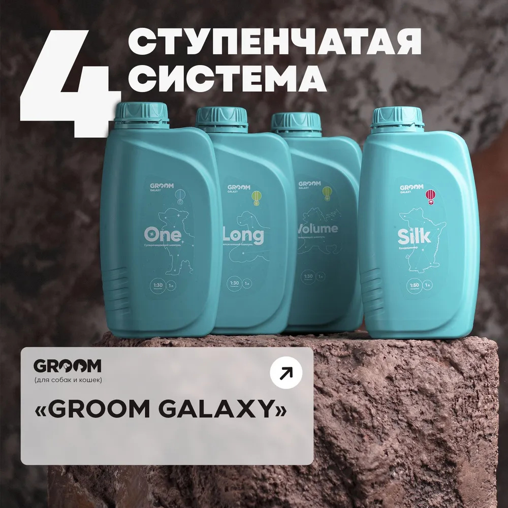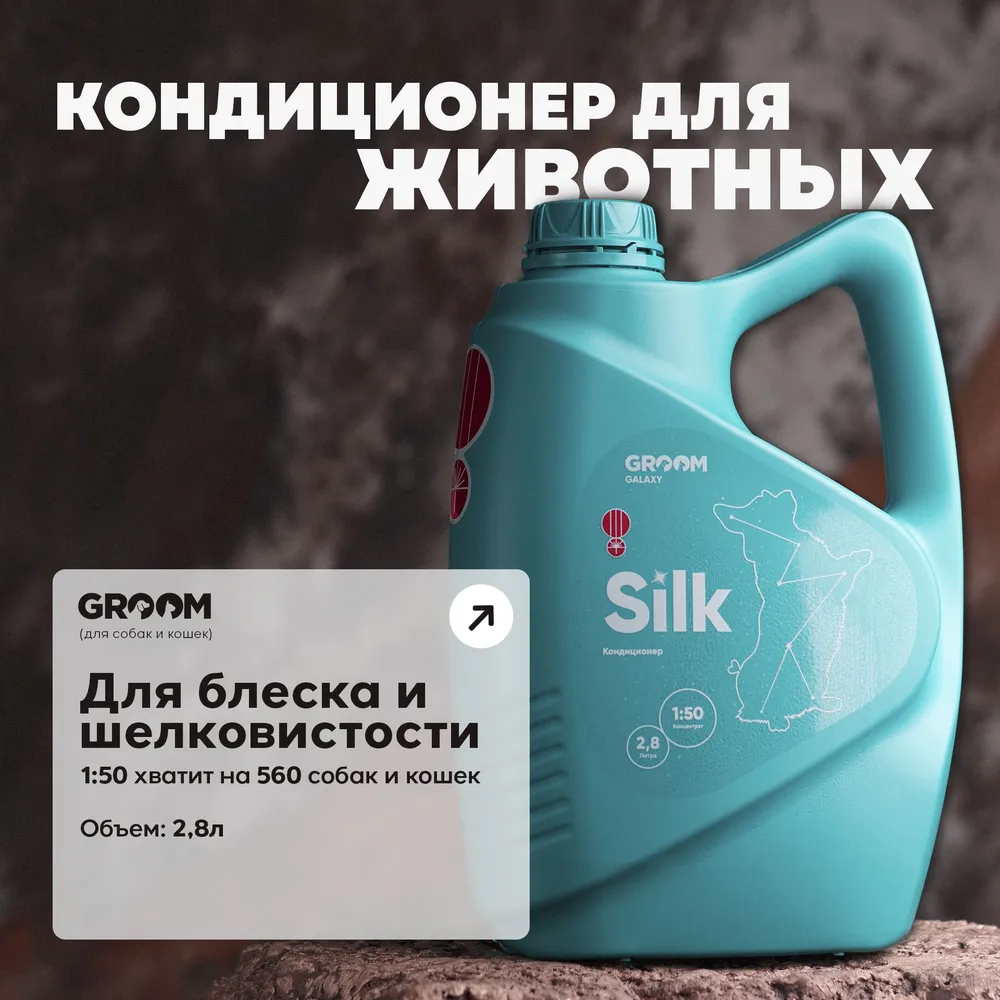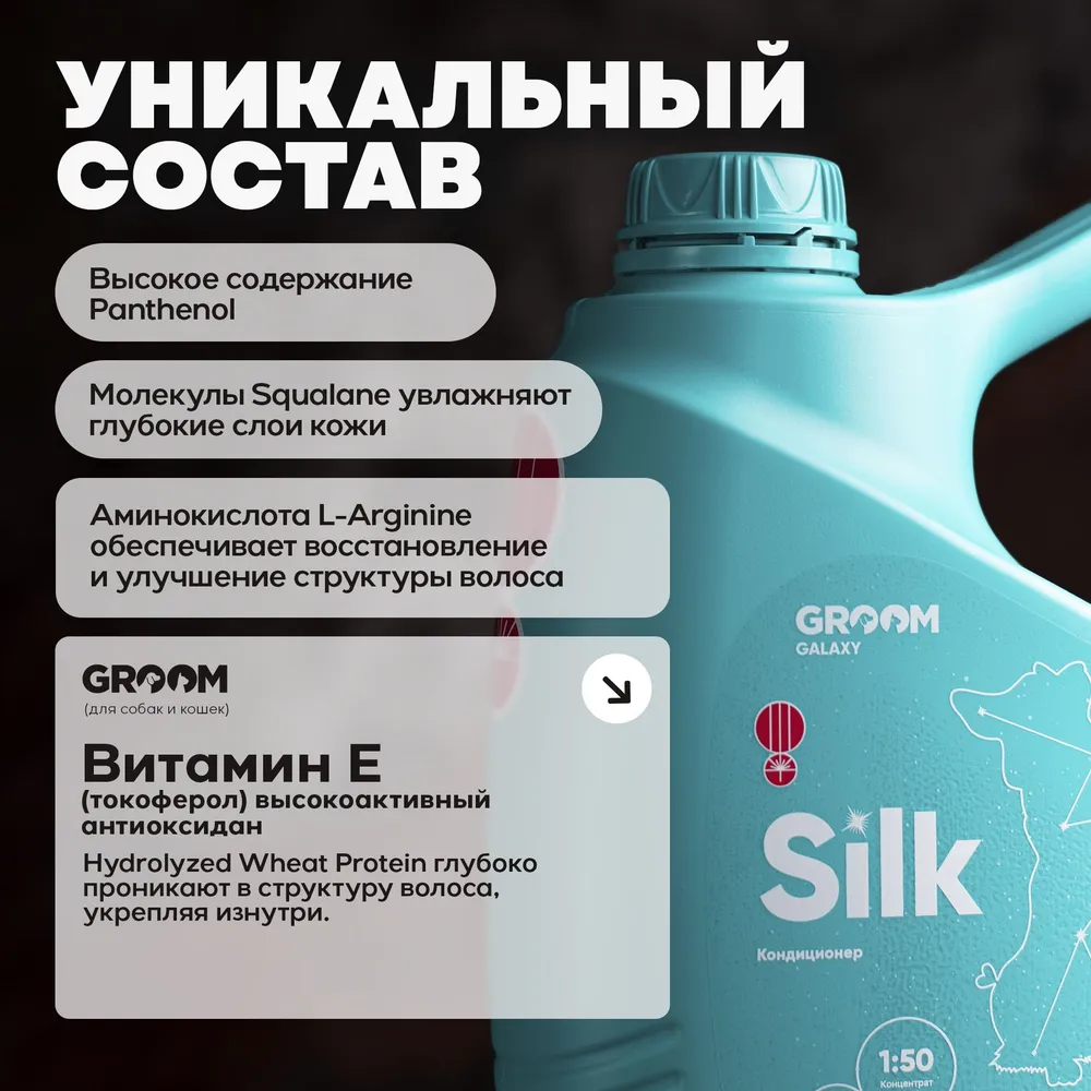 Кондиционер Silk Groom GalaxyCоздает эффект невероятной шелковистости и искрящегося блеска шерсти. Высокое содержание Panthenol увлажняет кожу, аминокислота L-Arginine, проникая в структуру волоса и шерсти, закрепляться на участках, которые сильно повреждены, восполняя их, обеспечивает восстановление и улучшение структуры волоса. Проникая в волосяной фолликул L-Arginine увеличивает микроциркуляцию в нем, обеспечивая усиленное поступление питательных веществ, что способствует росту здоровой шерсти. Hydrolyzed Wheat Protein глубоко проникают в структуру волоса, укрепляя его изнутри.Быстрая сушка питомца