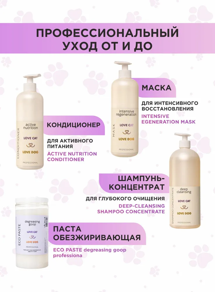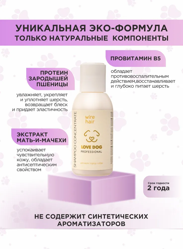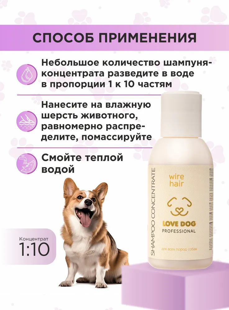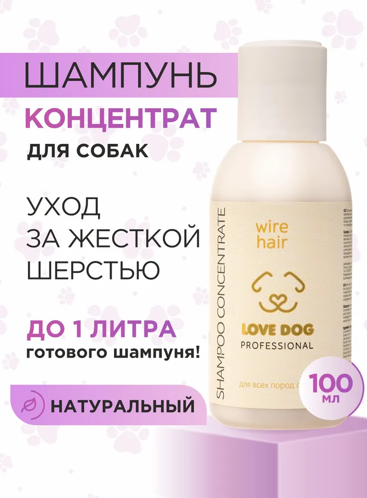 Станьте профессиональным грумером и стилистом для любимого питомца вместе с органической серией по уходу за собаками и кошками LOVE CAT LOVE DOG.Шампунь для жесткошерстных собак восстанавливает эластичность, естественно приподнимает волосы от корней. Шампунь для жесткой шерсти утолщает осевые и покровные волоски, добавляет им упругость и насыщенность цвета. Шампунь безопасен для щенков и взрослых собак чувствительных пород.Натуральные компоненты не сушат кожу: можно купать питомца так часто, как это необходимо. Шампунь для жесткошерстных собак отлично зарекомендовал себя как базовое средство для ухода за породами собак: йорк, такса, шнауцер, бувье, джек-рассел, терьер, пинчер.Мы разработали шампунь для собак Жесткая шерсть, а также другие уникальные средства ухода за животными с учетом опыта профессиональных грумеров и заводчиков. Органический шампунь для собак заботится не только о шерсти, но и не повреждает кожу ваших рук, в отличие от обычных синтетических средств. Мы за безопасное и приятное купание для всех участников!Протеин зародышей пшеницы увлажняет, укрепляет и уплотняет шерсть, возвращает блеск и придает эластичность.Провитамин В5 (д-пантенол) обладает противовоспалительным действием, восстанавливает и глубоко питает шерсть.Экстракт мать-и-мачехи успокаивает чувствительную кожу, обладает антисептическим свойством, а также содержит большое количество витаминов и микроэлементов.Даже если ваш любимый хвостик долгое время обходился без ухода, комплекс средств для собак и кошек LOVE CAT LOVE DOG поможет выглядеть так, как будто он побывал в дорогом груминг-салоне. Здоровые, ухоженные на профессиональном уровне шерсть и кожа четвероногого друга - без лишних трат и поездок. И всё это в привычных домашних условиях, никаких переживаний и стресса!Шампунь для жесткошерстных собак - это концентрат, который разводится 1 к 10. Даже флакона на 100 мл хватит надолго, он не займет много места при хранении.Рекомендации по уходу:Обработайте засаленные, жирные, сильно загрязненные участки шерсти Пастой для сильно-загрязненных шерсти и кожи. Обратите пристальное внимание на пробор хвоста, зону за ушами, под глазами животного.Пока паста растворяет загрязнения, распределите Гель-пасту для обновления цвета и структуры волоса по всей шерсти. Хорошо помассируйте.Смойте пасту и гель с шерсти. Нанесите подходящий Шампунь для собак и кошек или Шампунь-концентрат из нашей линейки: для Глубокого очищения, для Деликатного очищения, для Шикарного объема, для Особого блеска, для Жесткой шерсти.Помассируйте всё тело животного. Рекомендуем сначала вспенить шампунь для жесткошерстных собак губкой. Тщательно промойте шерсть.Завершите уход кондиционером (код товара 102554888008) или маской, в зависимости от потребностей шерсти вашего питомца. Усилит полученный результат Спрей-сыворотка.Мы гарантируем:растительные, натуральные ароматы наших продуктов нейтрализует неприятный запах шерсти;оптимальный именно для вас объем от 100 мл до 10 л для домашнего и профессионального использования;экономичный расход каждого средства. Например, горошины кондиционера хватит для кошки или небольшой собаки;никаких вредных химических добавок в составе, только польза натуральных компонентов;шампуни не вызывают привыкания, раз за разом действуют мягко и эффективно.
