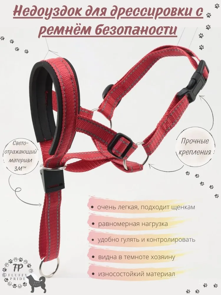 Недоуздок для собак основан на том же принципе, что и недоуздок лошади, если вы направите голову собаки, то тело последует за ним. Недоуздок состоит из нескольких нейлоновых ремешков, сшитых между собой. Носовой ремешок, сделанный в виде петли с мягкой подкладкой из приятного гладкого материала и со светоотражающей полосой, соединен с шейным отделом с помощью двух ремешков с регулирующимися бегунками, удобный замок (предотвращает внезапное открытие) быстро фиксирует изделие на голове собаки. Металлическое кольцо объединяет концы носового ремешка и к нему крепится поводок, есть дополнительный ремешок для дополнительной фиксации к ошейнику. Стильная черная фурнитура. Когда собака начинает тянуть в сторону заинтересовавшего ее объекта или еды на земле, петля автоматически затягивается вокруг морды и разворачивает ее в сторону натяжения поводка. Это не причиняет боль, но отвлекает внимание и направляет его на хозяина. Для определения размера измерьте шею за ушами собаки и размер морды. Таблица размеров на фото. Подходит для всех пород, за исключение плоскомордых.