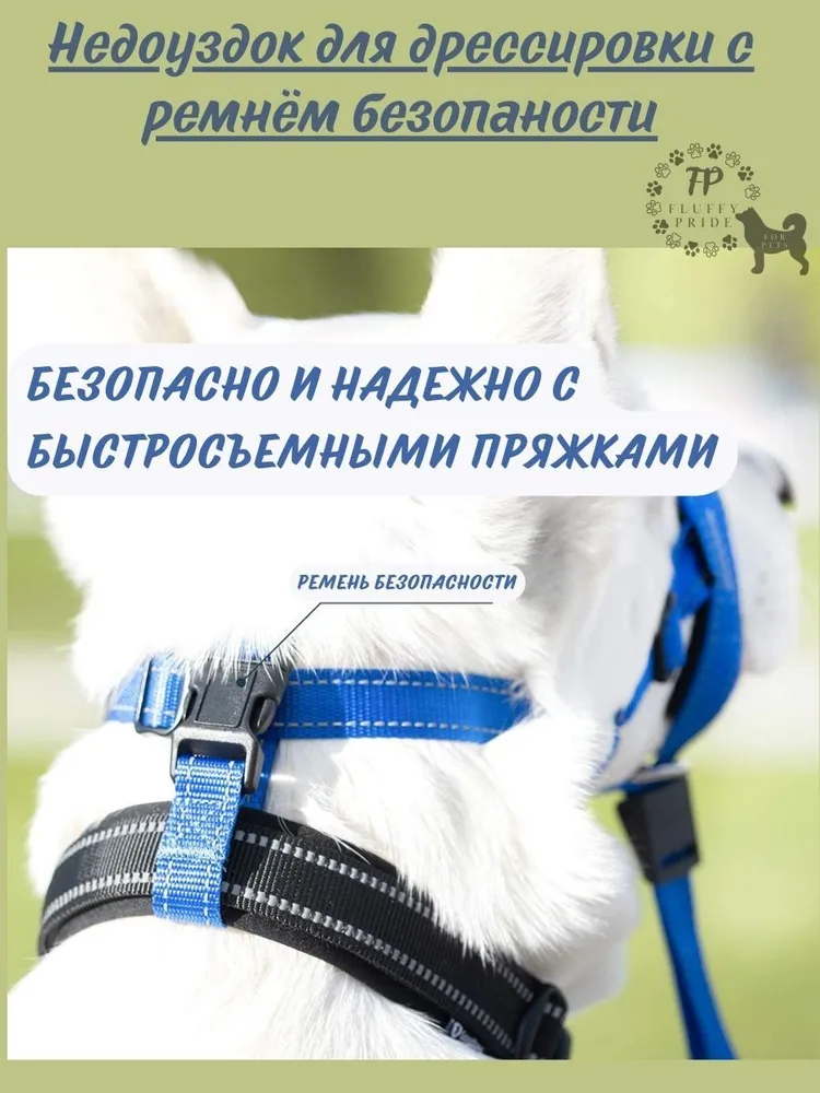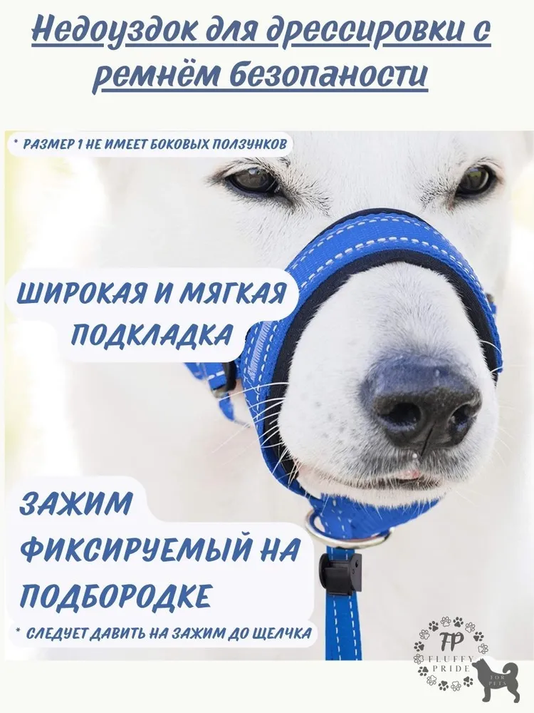 Недоуздок для собак основан на том же принципе, что и недоуздок лошади, если вы направите голову собаки, то тело последует за ним. Недоуздок состоит из нескольких нейлоновых ремешков, сшитых между собой. Носовой ремешок, сделанный в виде петли с мягкой подкладкой из приятного гладкого материала и со светоотражающей полосой, соединен с шейным отделом с помощью двух ремешков с регулирующимися бегунками, удобный замок (предотвращает внезапное открытие) быстро фиксирует изделие на голове собаки. Металлическое кольцо объединяет концы носового ремешка и к нему крепится поводок, есть дополнительный ремешок для дополнительной фиксации к ошейнику. Стильная черная фурнитура. Когда собака начинает тянуть в сторону заинтересовавшего ее объекта или еды на земле, петля автоматически затягивается вокруг морды и разворачивает ее в сторону натяжения поводка. Это не причиняет боль, но отвлекает внимание и направляет его на хозяина. Для определения размера измерьте шею за ушами собаки и размер морды. Таблица размеров на фото. Подходит для всех пород, за исключение плоскомордых.