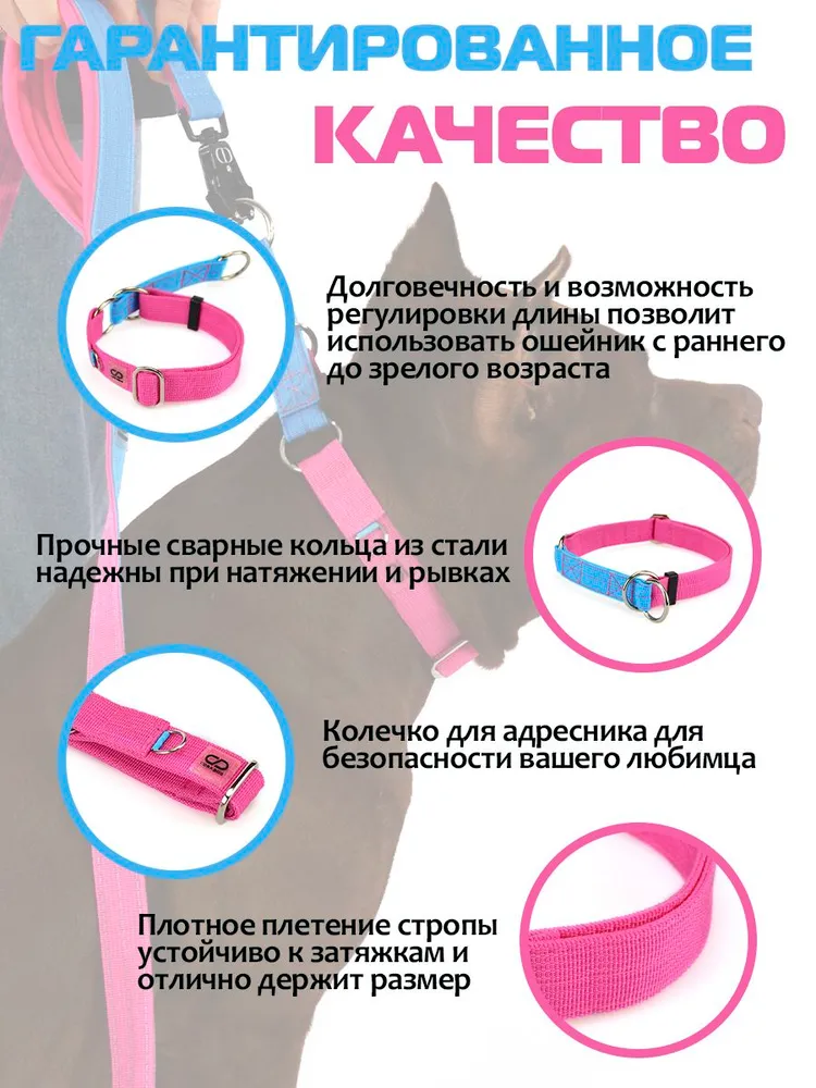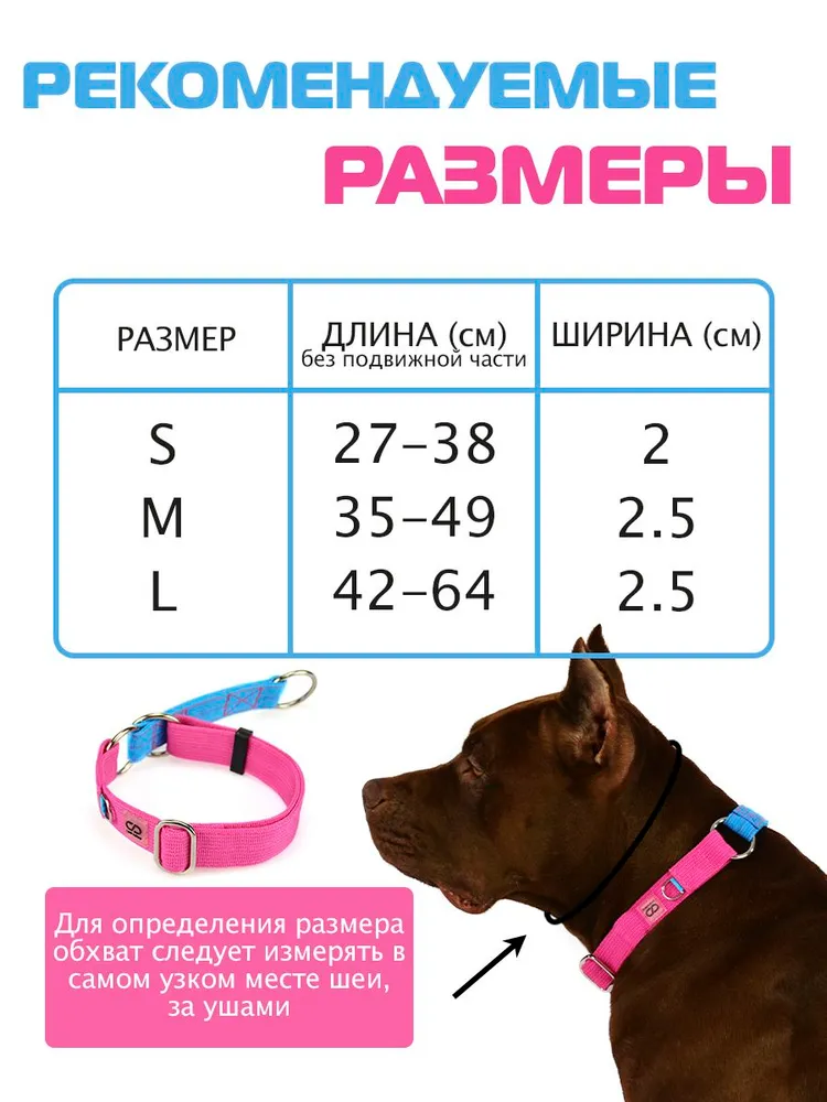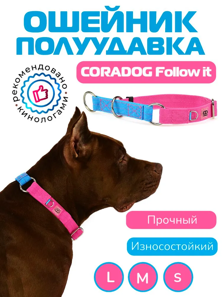 Ошейник CORADOG Follow it - специальный тип ошейников для собак, затягивается на шее собаки при натяжении. Есть ограничитель - он фиксируется на нужном размере и не затягивается больше, чем нужно. Ошейник-полуудавка свободно лежит на шее собаки, не натирая, не сковывая движений. Свободно надевается и снимается через голову. Но при натяжении поводка, пристегнутого за кольцо, ошейник затягивается, обхватывая шею собаки и не давая вывернуться. Такая конструкция безопаснее обычного ошейника, он не давит на переднюю часть горла, не травмирует шею. Полуудавка, несмотря на пугающее название, – это один из самых удобных и безопасных видов ошейников, который рекомендуют кинологи по всему миру. \n\nОшейник должен быть отрегулирован так, чтобы при натяжении поводка или рывке, он плотно обхватывал шею, так, чтобы собака не могла вывернуться из ошейника, но при этом и не душил ее. Такой ошейник один из самых надежных для пугливых или изворотливых, а также для мощных и резких собак.\n\nОшейник имеет стильный дизайн и доступен в разнообразном цветовом исполнении. Плотное плетение устойчиво к затяжкам. Многослойная прочная стропа и прочная сварная фурнитура. На ошейниках имеется дополнительное кольцо для адресника. \n\nОбхват шеи следует измерять в самом узком месте шеи, за ушами. \n\nРазмер S - 27-38 см (длина ошейника), ширина 2 см.\n\nРазмер M - 35-49 см (длина ошейника), ширина 2,5 см.\n\nРазмер L - 42-65 см (длина ошейника), ширина 2,5 см.