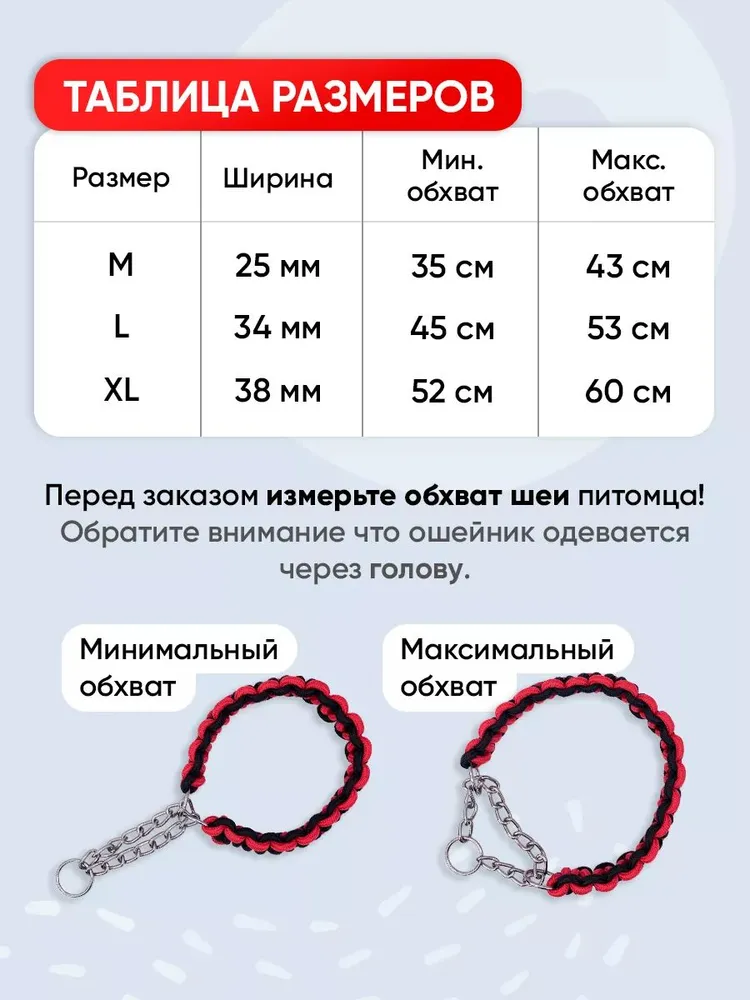 Рады Вам представить ошейник полуудавка от бренда WHISKEY, данная модель распространена у владельцев средних и больших пород собак, а так же у любителей тактической тематики и военной амуниции. К слову ошейник часто выбирают кинологи для тренировок и дрессировки крупных собак, для охоты или просто для выгула. Ну и конечно это идеальный повседневный вариант для игр на свежей природе. Размерная сетка позволит подобать ошейник как для щенка, так и обновить уже для взрослой собаки. Перед заказом измерьте обхват шеи питомца. Помните, нужно оставить зазор между шеей и ошейником, обычно достаточно оставить запас в 2-3 см. Собачий аксессуар так же идеально подойдет для щенков. Нейлоновый ошейник выглядит красиво, сплетен из цельного круглого шнурка из нейлона. Металическая фурнитура, фиксаторы полностью пропаяны, сам нашейник очень прочный на разрыв (рывковая цепь спокойно выдержит пса до 50кг). Удушающий ошейник имеет и успокоительный эффект. Наши клиенты говорят, декоративный ошейник выглядит очень модно и строго. Придает собаке строгий стиль. Строгач или как принято называть ринговка, выполнена в военной тематике, в практичности и догом внешнем виде. Выставочный аксессуар указывает на то, что собака является домашними. Изделие можно стирать, материал полность водостойкий и не впитывающий влагу, можно стирать в стиральной машинке, на ощейнике нет декора который сможет сломать ваше устройство, будьте спокойны и поддерживайте омуницию питомца в чистоте и сабака будет рада. Ошейникдля собачки прослужит очень долго при правильном уходе. Модные зоотовары для животных от WHISKEY проверены временем. Аксесуары - это идеальный выбор украшения и прекрасный подарок доя собаки, особенно ашейник! Спасибо что дочитали, и интерес к нашей продукции.