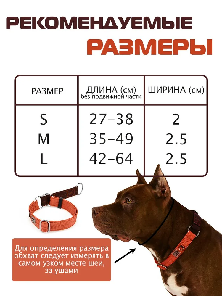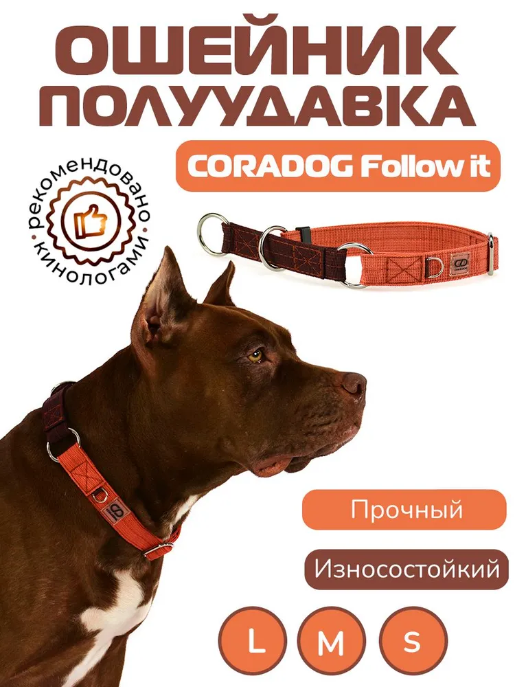 Ошейник CORADOG Follow it - специальный тип ошейников для собак, затягивается на шее собаки при натяжении. Есть ограничитель - он фиксируется на нужном размере и не затягивается больше, чем нужно. Ошейник-полуудавка свободно лежит на шее собаки, не натирая, не сковывая движений. Свободно надевается и снимается через голову. Но при натяжении поводка, пристегнутого за кольцо, ошейник затягивается, обхватывая шею собаки и не давая вывернуться. Такая конструкция безопаснее обычного ошейника, он не давит на переднюю часть горла, не травмирует шею. Полуудавка, несмотря на пугающее название, – это один из самых удобных и безопасных видов ошейников, который рекомендуют кинологи по всему миру. \n\nОшейник должен быть отрегулирован так, чтобы при натяжении поводка или рывке, он плотно обхватывал шею, так, чтобы собака не могла вывернуться из ошейника, но при этом и не душил ее. Такой ошейник один из самых надежных для пугливых или изворотливых, а также для мощных и резких собак.\n\nОшейник имеет стильный дизайн и доступен в разнообразном цветовом исполнении. Плотное плетение устойчиво к затяжкам. Многослойная прочная стропа и прочная сварная фурнитура. На ошейниках имеется дополнительное кольцо для адресника. \n\nОбхват шеи следует измерять в самом узком месте шеи, за ушами. \n\nРазмер S - 27-38 см (длина ошейника), ширина 2 см.\n\nРазмер M - 35-49 см (длина ошейника), ширина 2,5 см.\n\nРазмер L - 42-65 см (длина ошейника), ширина 2,5 см.