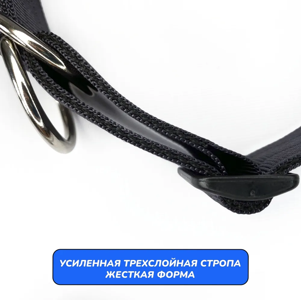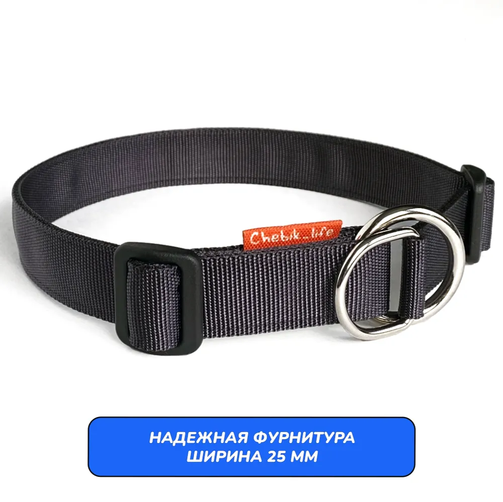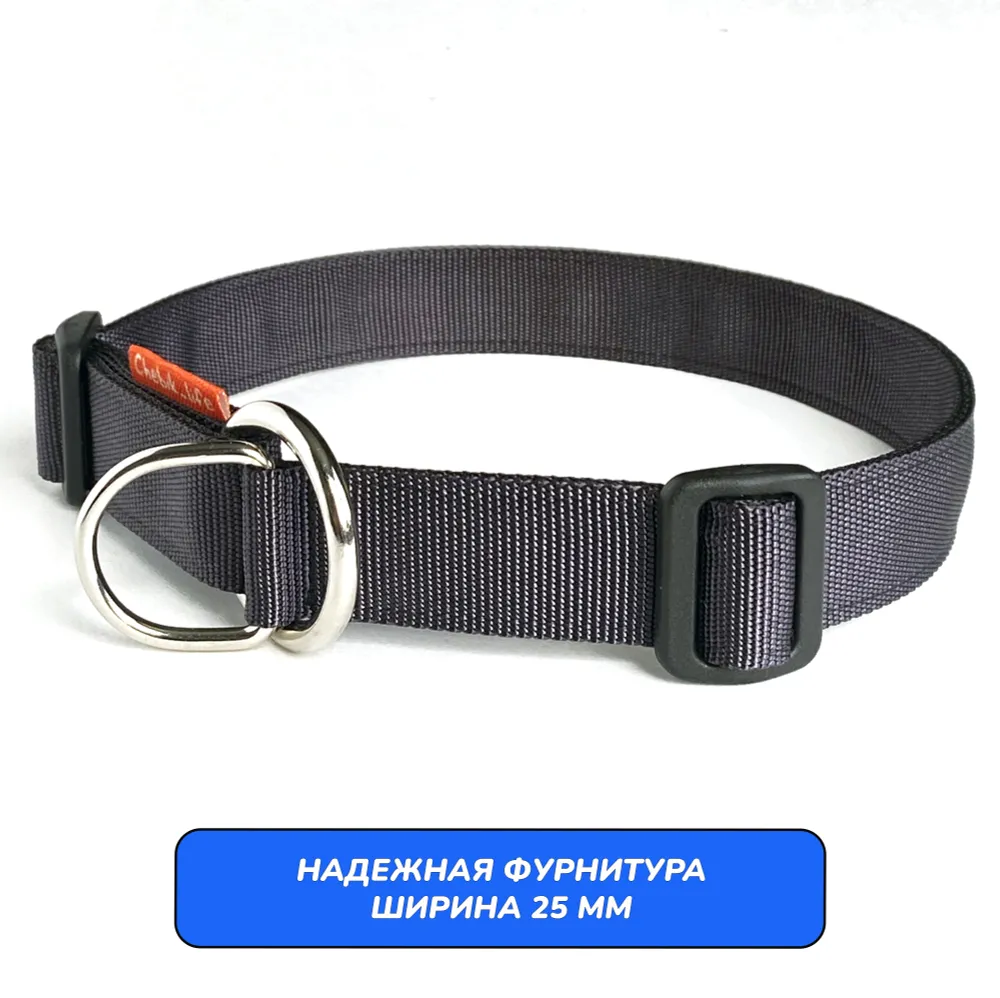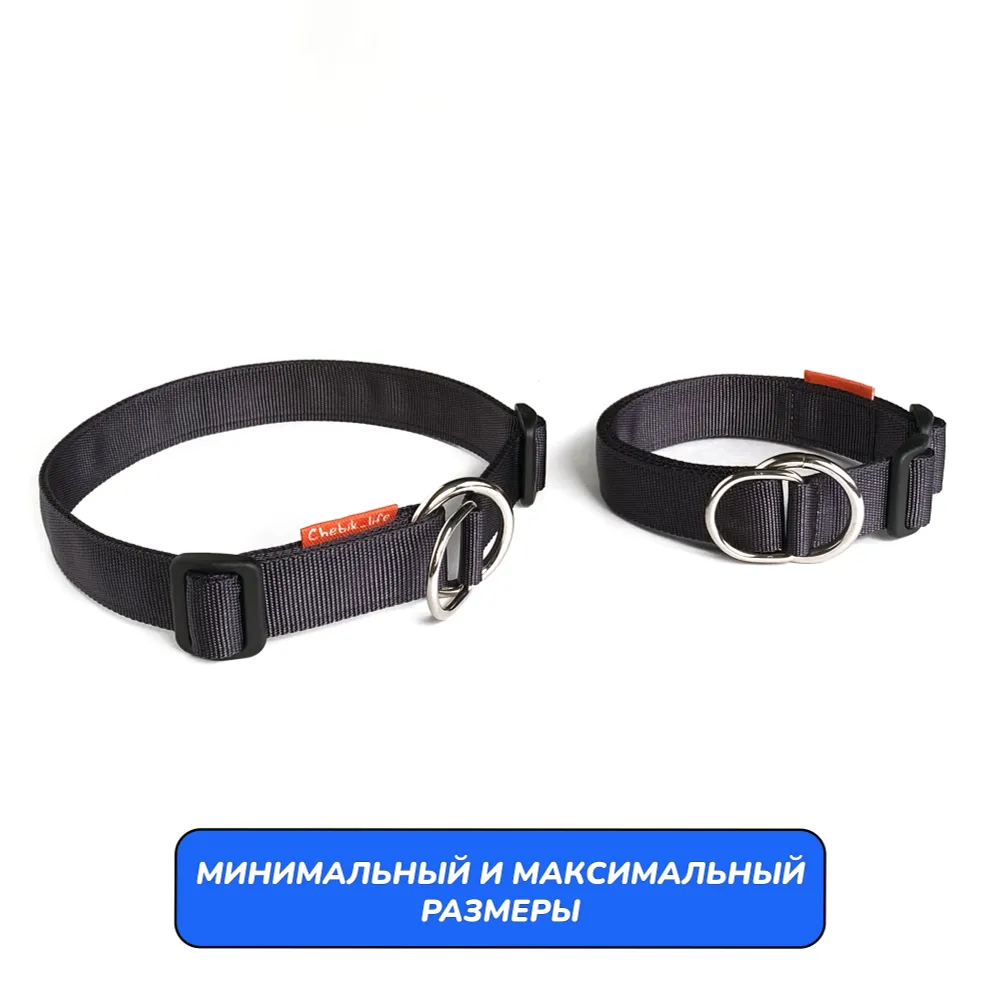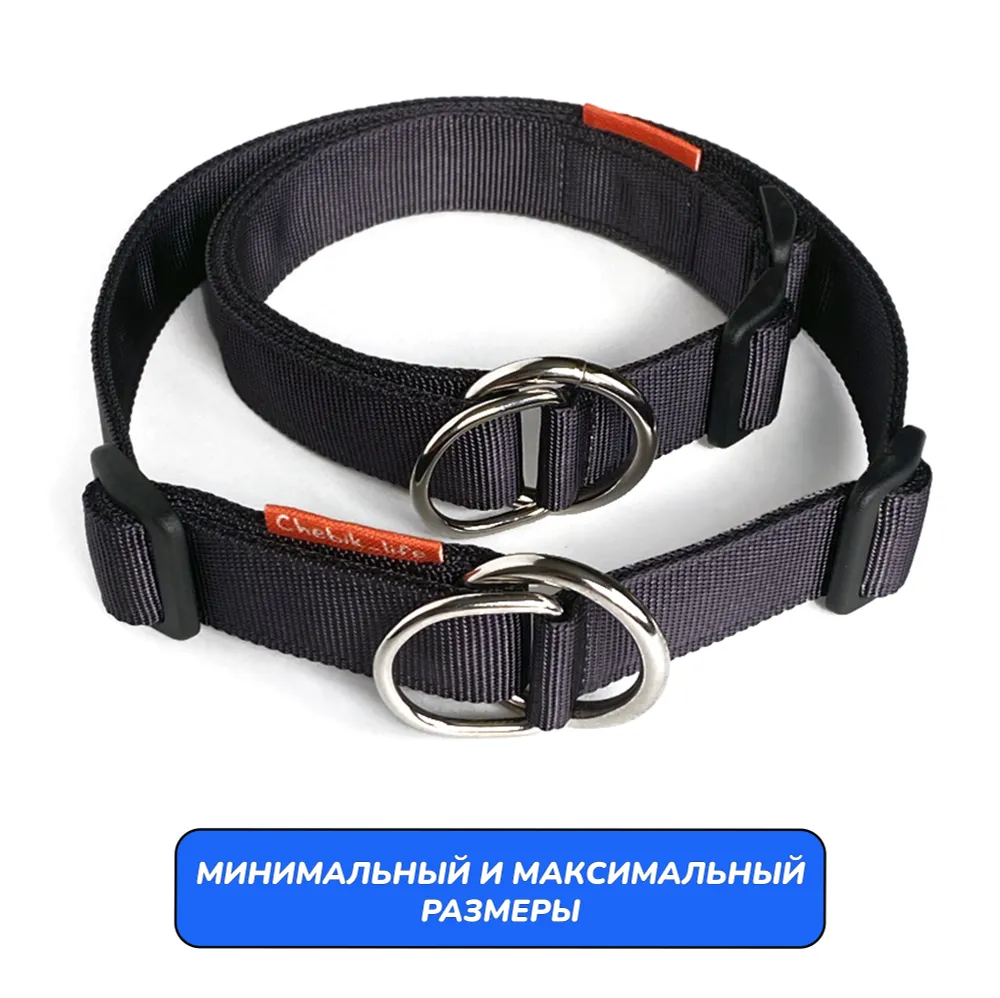 Ошейник свободно висит на шее собаки. При натяжении поводка, полукольцо затягивает стропу до фиксирующей пряжки, уменьшая обхват до минимального. Собака надежно удерживается рядом, не испытывая дискомфорта. Вы можете убрать регулирующую пряжку вовсе, тогда ошейник будет работать как удавка (для опытных владельцев).Отрегулируйте размер