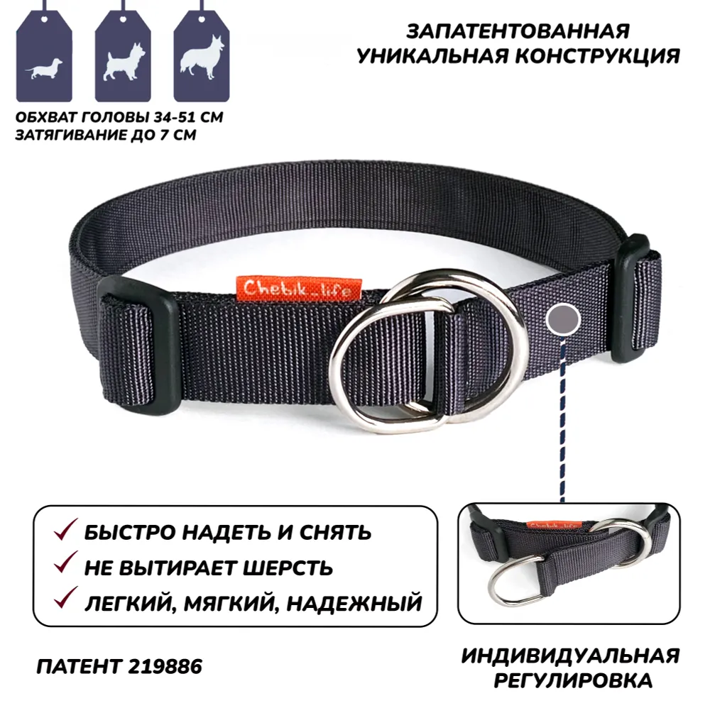 Наш ошейник является уникальным изделием, обладающим инновационной конструкцией, защищенной патентом. Мы гордимся тем, что наша модель мартингейла является результатом тщательной работы и сотрудничества с волонтерами. Она была специально разработана для использования в приютах для бездомных животных и доказала свою эффективность в повседневном использовании с собаками любого темперамента.- Главное преимущество нашего мартингейла - возможность регулировки затягивающей стропы. Ошейник можно очень точно настроить под вашу собаку, регулируя разницу между минимальным и максимальным обхватом с помощью регулирующей пряжки. В отличие от стандартного мартингейла, у которого фиксированная длина затягивающей стропы, наша модель подходит абсолютно всем собакам. Даже если разница между обхватами головы и шеи собаки минимальная или очень большая, собака не сможет выскользнуть из ошейника.- Наша конструкция позволяет надевать и снимать ошейник всего за несколько секунд. Благодаря отсутствию фастекса (пряжек), ошейник надежно фиксируется и не расстегнется в неподходящий момент на улице.- Ошейник также не натирает длинную шерсть и не образует складки, так как не требует плотного затягивания. Во время прогулки он свободно висит на шее вашего питомца, не вызывая дискомфорта.Универсальный размер:Благодаря двум регулирующим пряжкам, ошейник подходит собакам средних и крупных пород. Регулировка размера нужна только после покупки и займет всего пару минут.Стропа:Полиэстер 100% ширина 25 мм.Пряжка регулятор, кольцо и полукольцо:Полиацеталь (нагрузка до 50 кг)Кольцо стальное 4 мм. В данном варианте мы используем такелажное сварное полированное кольцо (без видимого шва). Разрывная нагрузка 300 кг. Оттенок стали кольца незначительно отличается от оттенка стали полукольца. Если для вас это критично, рекомендуем выбрать другой цвет или размер.Полукольцо стальное сварное 4 мм.Уход:Для очистки рекомендуем деликатную стирку при температуре 30° без сушки и с отжимом на минимальных оборотах.Принцип действия