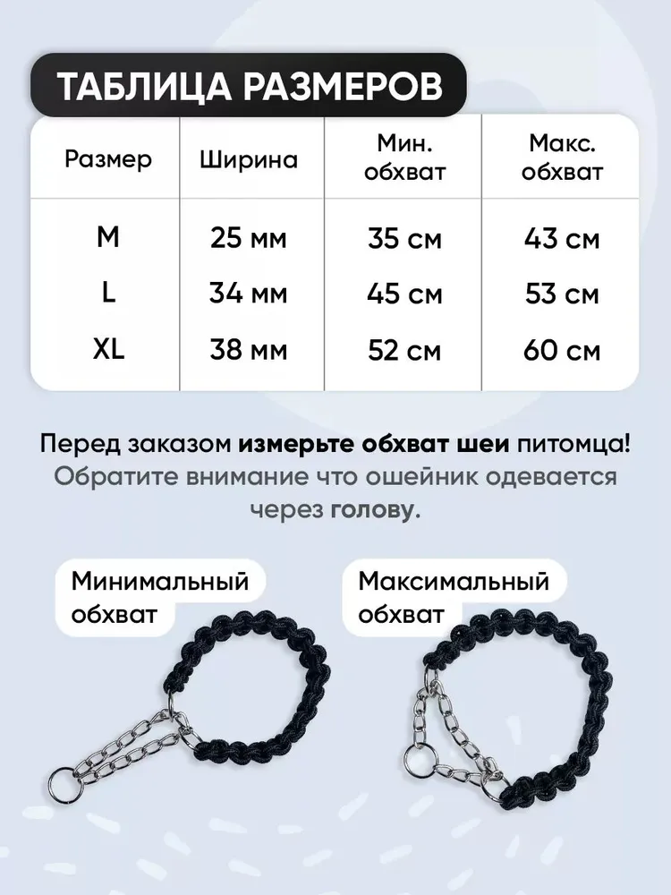 Рады Вам представить ошейник полуудавка от бренда WHISKEY, данная модель распространена у владельцев средних и больших пород собак, а так же у любителей тактической тематики и военной амуниции. К слову ошейник часто выбирают кинологи для тренировок и дрессировки крупных собак, для охоты или просто для выгула. Ну и конечно это идеальный повседневный вариант для игр на свежей природе. Размерная сетка позволит подобать ошейник как для щенка, так и обновить уже для взрослой собаки. Перед заказом измерьте обхват шеи питомца. Помните, нужно оставить зазор между шеей и ошейником, обычно достаточно оставить запас в 2-3 см. Собачий аксессуар так же идеально подойдет для щенков. Нейлоновый ошейник выглядит красиво, сплетен из цельного круглого шнурка из нейлона. Металическая фурнитура, фиксаторы полностью пропаяны, сам нашейник очень прочный на разрыв (рывковая цепь спокойно выдержит пса до 50кг). Удушающий ошейник имеет и успокоительный эффект. Наши клиенты говорят, декоративный ошейник выглядит очень модно и строго. Придает собаке строгий стиль. Строгач или как принято называть ринговка, выполнена в военной тематике, в практичности и догом внешнем виде. Выставочный аксессуар указывает на то, что собака является домашними. Изделие можно стирать, материал полность водостойкий и не впитывающий влагу, можно стирать в стиральной машинке, на ощейнике нет декора который сможет сломать ваше устройство, будьте спокойны и поддерживайте омуницию питомца в чистоте и сабака будет рада. Ошейникдля собачки прослужит очень долго при правильном уходе. Модные зоотовары для животных от WHISKEY проверены временем. Аксесуары - это идеальный выбор украшения и прекрасный подарок доя собаки, особенно ашейник! Спасибо что дочитали, и интерес к нашей продукции.