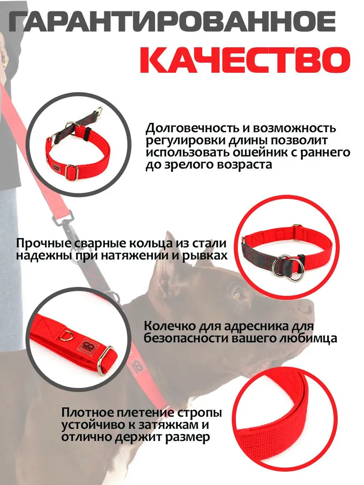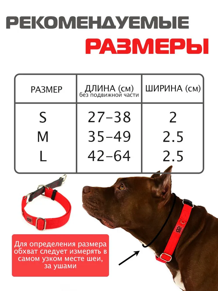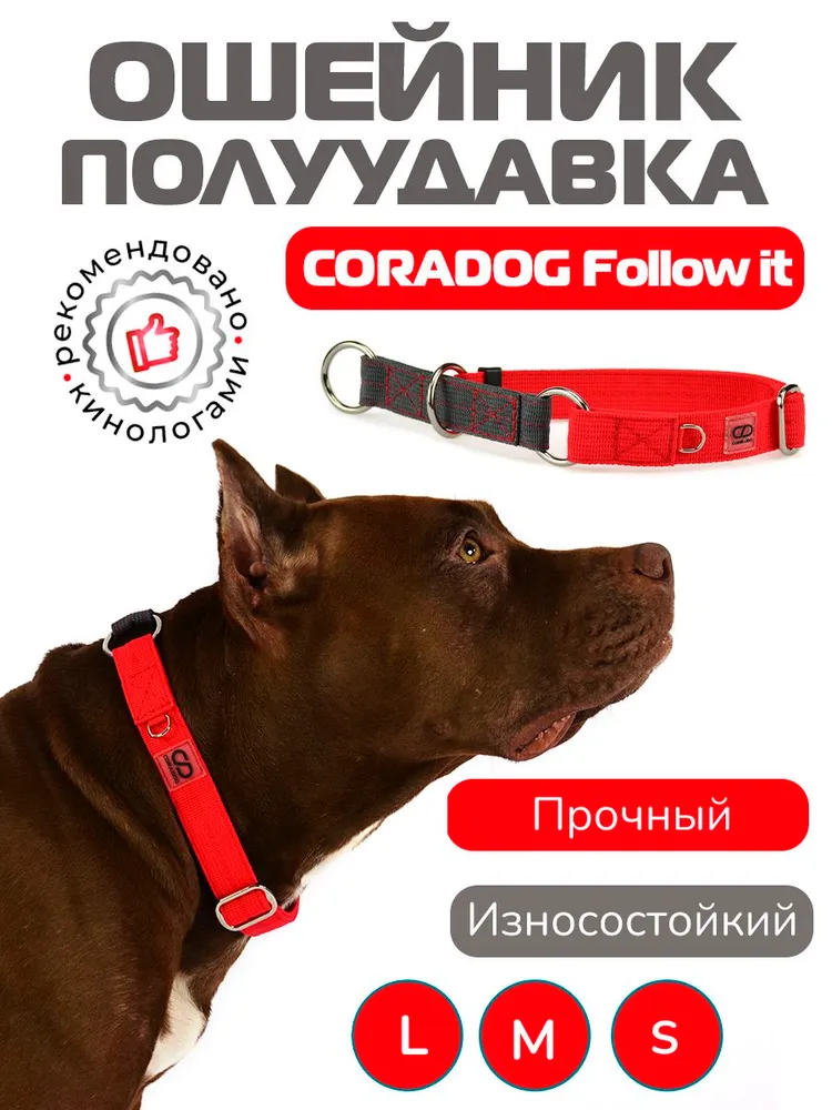 Ошейник CORADOG Follow it - специальный тип ошейников для собак, затягивается на шее собаки при натяжении. Есть ограничитель - он фиксируется на нужном размере и не затягивается больше, чем нужно. Ошейник-полуудавка свободно лежит на шее собаки, не натирая, не сковывая движений. Свободно надевается и снимается через голову. Но при натяжении поводка, пристегнутого за кольцо, ошейник затягивается, обхватывая шею собаки и не давая вывернуться. Такая конструкция безопаснее обычного ошейника, он не давит на переднюю часть горла, не травмирует шею. Полуудавка, несмотря на пугающее название, – это один из самых удобных и безопасных видов ошейников, который рекомендуют кинологи по всему миру. \n\nОшейник должен быть отрегулирован так, чтобы при натяжении поводка или рывке, он плотно обхватывал шею, так, чтобы собака не могла вывернуться из ошейника, но при этом и не душил ее. Такой ошейник один из самых надежных для пугливых или изворотливых, а также для мощных и резких собак.\n\nОшейник имеет стильный дизайн и доступен в разнообразном цветовом исполнении. Плотное плетение устойчиво к затяжкам. Многослойная прочная стропа и прочная сварная фурнитура. На ошейниках имеется дополнительное кольцо для адресника. \n\nОбхват шеи следует измерять в самом узком месте шеи, за ушами. \n\nРазмер S - 27-38 см (длина ошейника), ширина 2 см.\n\nРазмер M - 35-49 см (длина ошейника), ширина 2,5 см.\n\nРазмер L - 42-65 см (длина ошейника), ширина 2,5 см.
