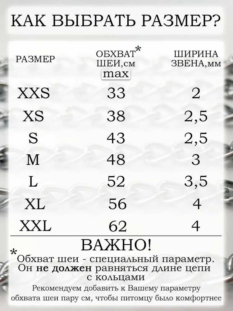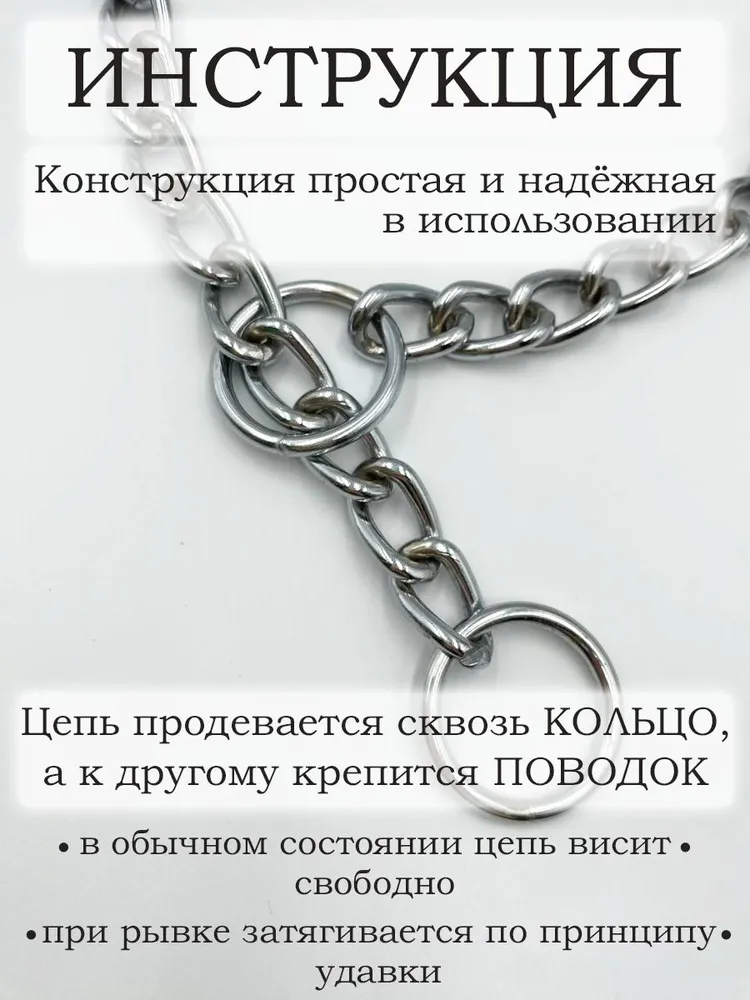 Ошейник-удавка - незаменимый аксессуар для контроля за собакой во время прогулок. Металлический ошейник предназначен для контроля, обучения и дрессировки собак с проблемами послушания, контролем агрессии мелких, средних пород, а также крупных пород. Цепь для собак изготовлена из нержавеющей стали, обладает достаточной прочностью, чтобы сдержать рывки питомца. Металичесские звенья имеют гладкую поверхность, от чего шерсть собаки не повреждается. А строгий дизайн делает этот ошейник идеальным аксессуаром. Удобный и эффективный в использовании, эта цепь удавка поможет вам добиться желаемых результатов при обучении вашего питомца. Рывковая цепь позволяет контролировать поведение собаки безопасным и эффективным способом. Он обеспечивает строгий контроль над питомцем благодаря специальной цепи-удавке, позволяя регулировать давление в зависимости от поведения собаки. Идеальный выбор для тренировки и обучения, а также для предотвращения рывков и неповиновения. Эффективность использования таких ошейников заключается в их особой конструкции: на концах цепи имеются кольца, при проходе в одно из них цепь затягивается при давлении. Собака, которая пытается вырваться, испытывает неприятные ощущения, поэтому вынуждена прекратить попытки тянуть поводок. Благодаря этому достигается воспитательный эффект. Является хорошей заменой строгого ошейника с шипами, который причиняет боль собаке.