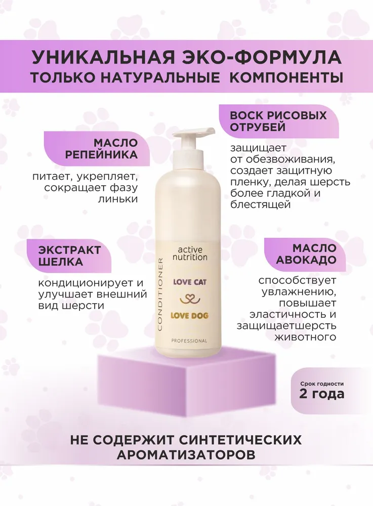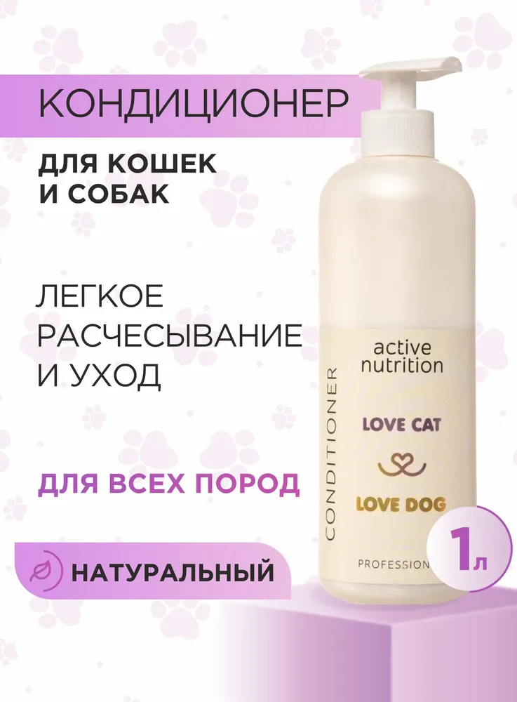 Станьте профессиональным грумером и стилистом для любимого питомца вместе с органической серией по уходу за собаками и кошками LOVE CAT LOVE DOG. Кондиционер для собак и кошек Активное питание помогает шерсти стать блестящей и шелковистой. Разглаживает каждый волосок, чтобы вычесывание питомца было простым и быстрым делом для вас.Мы разработали кондиционер для собак и шампунь для кошек, а также другие уникальные средства для ухода за животными с учетом опыта профессиональных грумеров и заводчиков.Органический кондиционер для собак и кошек заботится не только о шерсти, но и не повреждает кожу ваших рук, в отличие от обычных синтетических средств. Мы за безопасное и приятное купание для всех участников!Кондиционер отлично подходит для ухода за длинношерстными собаками или кошками.Масло репейника обладает питающим, укрепляющим эффектом, оказывает благоприятное действие на структуру волос животного, сокращает фазу линьки.Воск рисовых отрубей защищает шерсть собаки и кошки от обезвоживания, создает защитную пленку, делая шерстку более гладкой и блестящей.Экстракт шелка кондиционирует и улучшает внешний вид шерсти питомца.Масло авокадо способствует увлажнению, повышает эластичность и защищает шерсть животного от вредных воздействий окружающей среды.Даже если ваш любимый хвостик долгое время обходился без мытья, комплекс средств по уходу за собаками и кошками LOVE CAT LOVE DOG поможет выглядеть так, как будто он побывал в дорогом груминг-салоне. Здоровые, ухоженные на профессиональном уровне шерсть и кожа четвероногого друга - без лишних трат и поездок. И всё это в привычных домашних условиях, никаких переживаний и стресса!Рекомендации по уходу:Обработайте засаленные, жирные, особо грязные участки шерсти Пастой для сильно загрязненных шерсти и кожи. Обратите пристальное внимание на пробор хвоста, зону за ушами, под глазами животного.Пока паста растворяет загрязнения, распределите Гель-пасту для обновления цвета и структуры волоса по всей шерсти. Хорошо помассируйте.Смойте пасту и гель с шерсти. Нанесите подходящий Шампунь для собак и кошек или Шампунь-концентрат из нашей линейки: для Глубокого очищения, для Деликатного очищения, для Шикарного объема, для Особого блеска, для Жесткой шерсти.Помассируйте всё тело животного. Рекомендуем сначала вспенить шампунь губкой. Тщательно промойте шерсть.Завершите уход кондиционером для кошек и собак или маской, в зависимости от потребностей шерсти вашего питомца. Усилит полученный результат Спрей-сыворотка.Мы гарантируем:растительные, натуральные ароматы наших продуктов нейтрализует неприятный запах шерсти;оптимальный именно для вас объем от 100 мл до 10 л для домашнего и профессионального использования;экономичный расход каждого средства. Например, горошины кондиционера хватит для кошки или небольшой собаки;никаких вредных химических добавок в составе, только польза натуральных компонентов;шампуни не вызывают привыкания, раз за разом действуют мягко и эффективно.