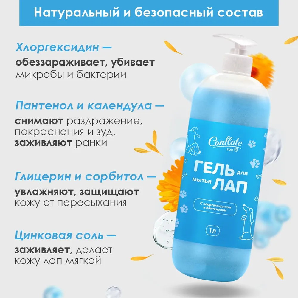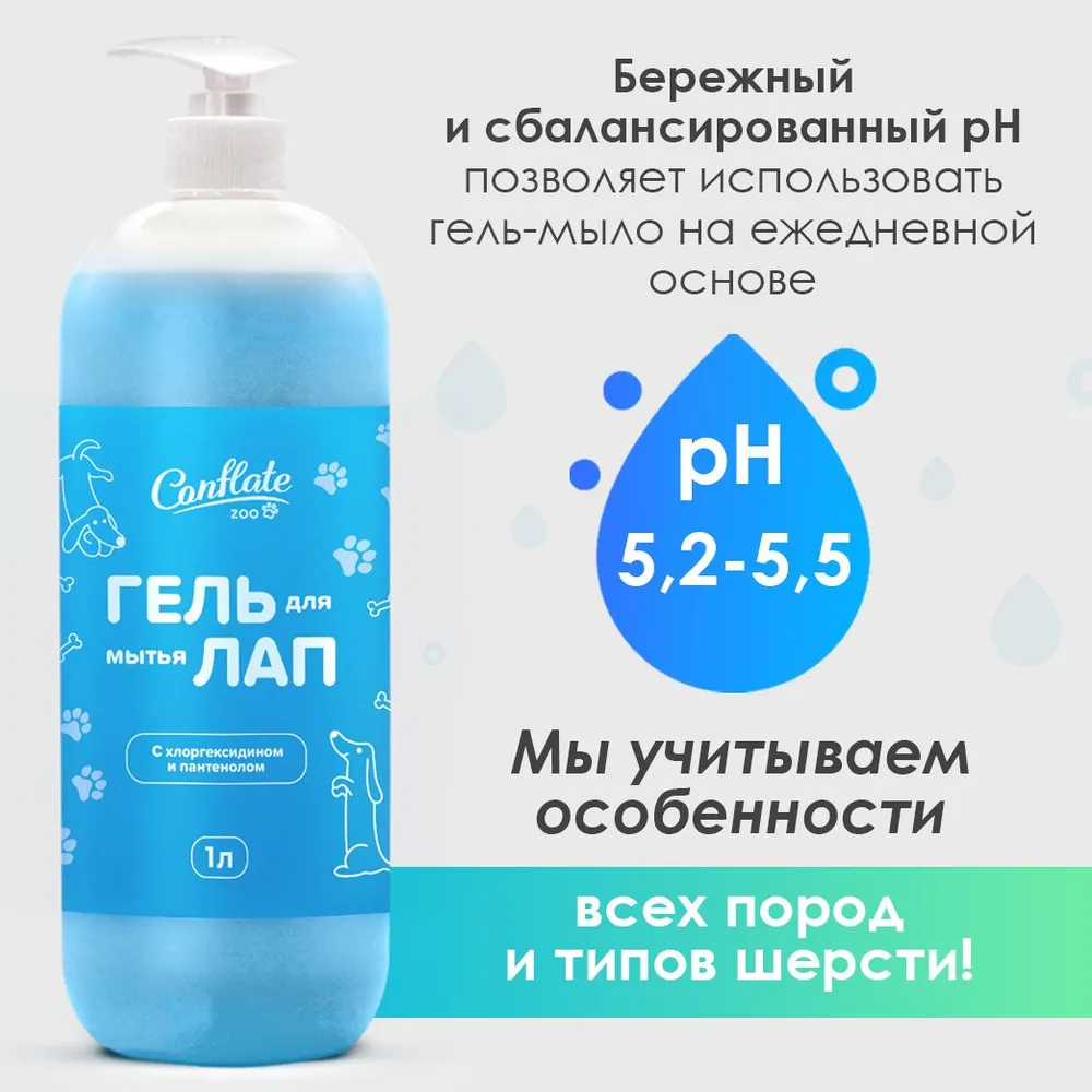 Прогулка для собаки – настоящая радость. Им не важны погодные условия за окном: на улице могут быть лужи или слякоть – это не остановит ни одного любителя игр на природе. Уход за кожным покровом и шерстью – важный ритуал для хозяина и его питомца. Для того чтобы этот процесс был легким и приятным, мы создали гель для мытья лап собак Conflate ZOO с хлоргексидином и пантенолом – это антибактериальное мыло-пенка, которое предназначено для ухода за лапами собак и кошек. Груминг и уход для собак - это важный процесс для поддержания гигиены вашего животного. ЭКО мыло для собак для лап - это качественный продукт, который разработан специально для того, чтобы обеспечить максимально эффективный уход за лапами вашего питомца. Это эко мыло без запаха лап Conflate ZOO является отличным выбором для тех, кто ищет надежное и эффективное средство для мытья лап своих питомцев. Мыло для животных помогает бороться с бактериями, которые могут привести к инфекциям и другим заболеваниям, помогает избавиться от от запаха для собак. Ведь запах животных очень сложно удалить. Благодаря использованию хлоргексидина, этот гель обладает мощными антибактериальными свойствами, которые помогают убивать бактерии и предотвращать их рост, помогает против запаха животных. Пантенол, входящий в состав геля, обладает увлажняющими свойствами и способствует быстрому заживлению мелких ранок и трещин на лапах. Мыло для лап животных Conflate ZOO является не только эффективным средством для борьбы с бактериями, но и отличным средством для ухода за лапами вашего питомца. Мыло для лап собак Conflate ZOO имеет объем 1 литр, что позволяет использовать его в течение длительного времени. Мыло пена это удобно и экономично, особенно если у вас несколько животных. Мыло для мытья лап от Conflate ZOO является гипоаллергенным и не содержит запаха, что делает его идеальным выбором для тех, кто хочет обеспечить своему питомцу максимальный комфорт и безопасность как мыло пенка. Пенка мыло антибактериальное также подходит для всех пород собак и других животных, в том числе для мелких пород. Conflate зу – это бренд, который занимается производством косметики и товаров для ухода за животными. Все продукты и косметика для собак этого бренда разработаны с учетом особенностей ухода за животными и обеспечивают высокое качество и эффективность. Если вы ищете качественное антибактериальное мыло для лап своего питомца, то мыло гипоаллергенное Conflate ZOO с хлоргексидином и пантеоном – это отличный выбор. Он обеспечивает надежную защиту от бактерий и эффективный уход за лапами вашего питомца. Мытье лап можно можно комплексно использовать еще и крем для лап собак, воск для лап собак и другие товары для собак мелких пород. Мыло для лап для собак может использоваться как гипоаллергенный шампунь для собак всех возрастов, пород, длины и цвета шерсти с ароматом. С любовью и заботой, Ваш Conflate ZOO !