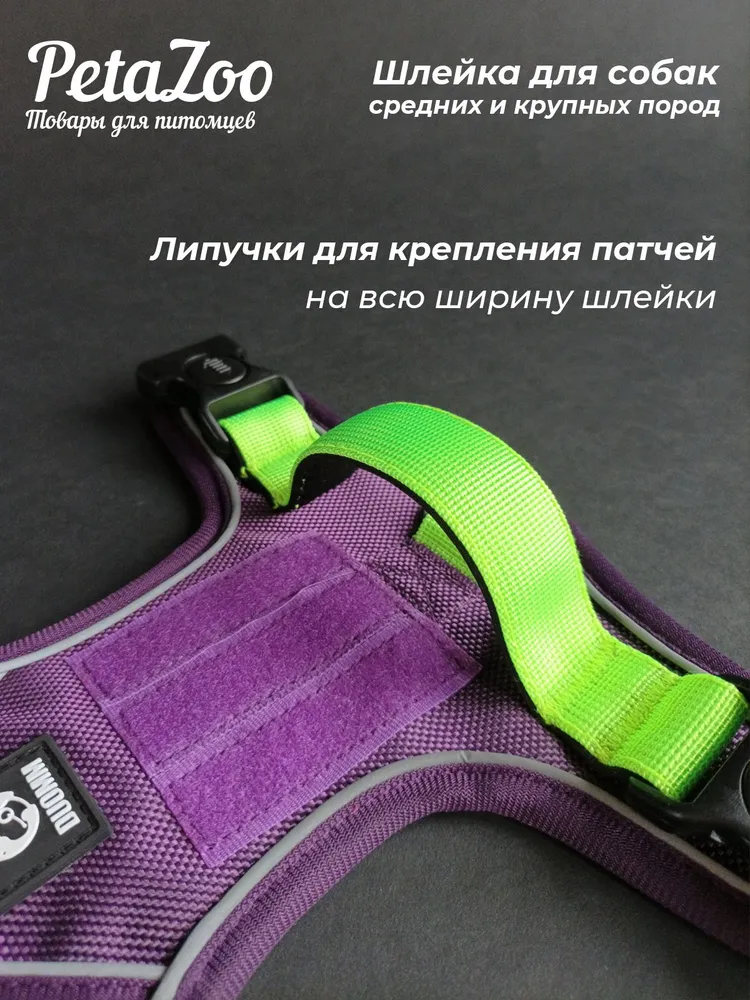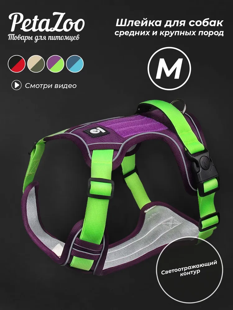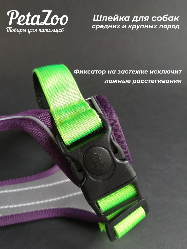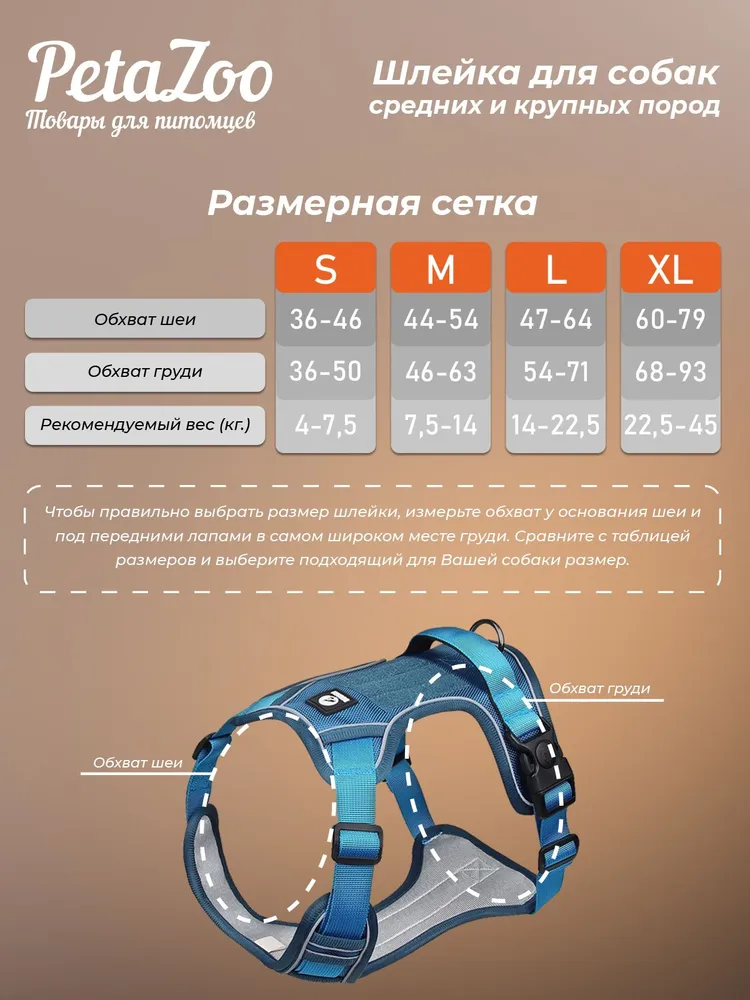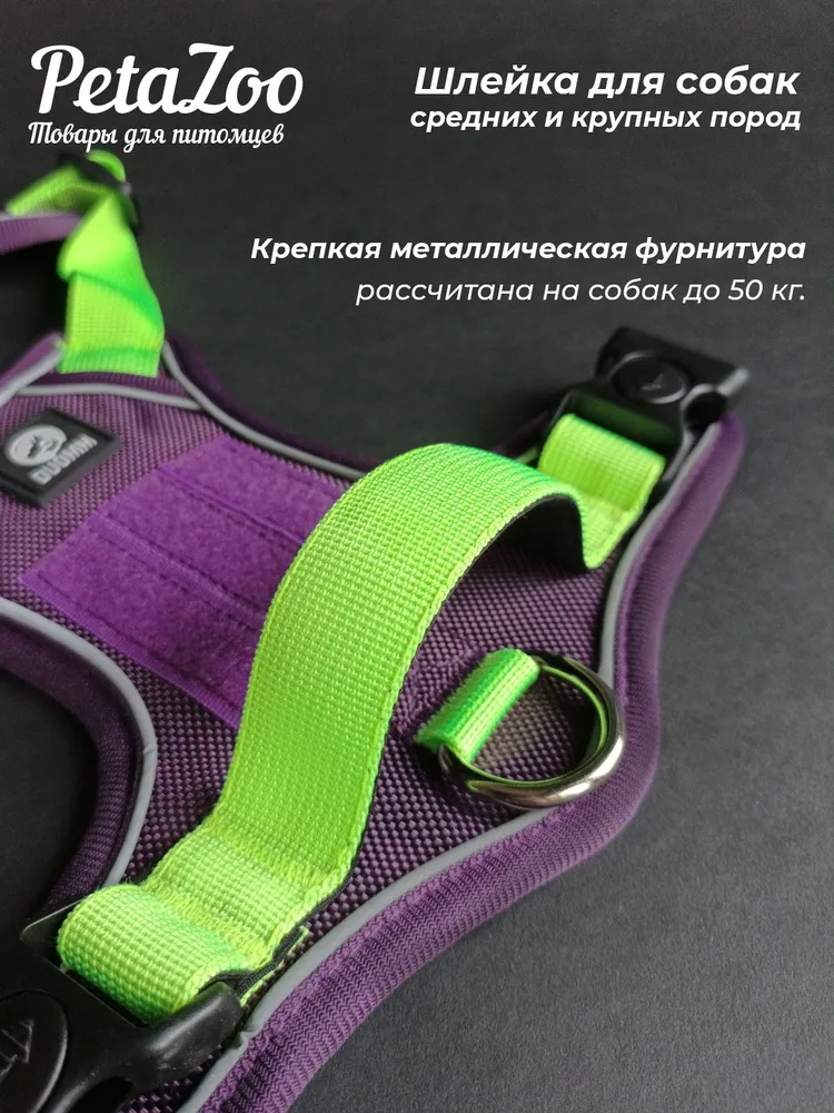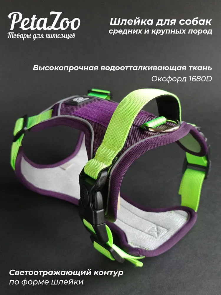 Магазин бренда PetaZoo предлагает Вашему вниманию новое изделие – шлейка для собак средних и крупных пород.\n\nШлейка для собак средних пород предназначена для безопасного и комфортного выгуливания питомца. Так же изделие может быть использовано как альтернатива ошейнику, поскольку легко переносит рывковые усилия на грудь, не задействуя шею. Шлейка плотно прилегает к телу питомца, что не позволит ему выскользнуть. Ремень и крепления позволяют отрегулировать размер шлейки по размеру.\n\nПоводок крепится к металлическому кольцу на спине, которое рассчитано на собак до 50 килограмм, выдерживает сильные рывки и позволяет со спокойствием контролировать собаку. \nБыстросъемная пряжка легко застегивается и расстегивается, позволяя быстро и удобно снять шлейку с животного. Так же на застежке расположен тумблер-фиксатор, изменив положение которого можно исключить ложные расстегивания.\n\nШлейка содержит светоотражающие элементы по контуру для безопасных прогулок в вечернее и ночное время. Размерная таблица представлена на фото.\n\nШлейка для собак изготовлена из высокопрочной ткани оксфорд 1680D PU. Это плотная, высокопрочная, водоотталкивающая, синтетическая ткань. Материал обладает повышенной износостойкостью и максимальной прочностью к разрывам.\n\nНаша команда серьезно подошла к выбору данной модели для наших покупателей. Наши шлейки для собак имеют эргономичную форму, анатомическую посадку и обеспечивают максимальный комфорт при выгуле собаки.