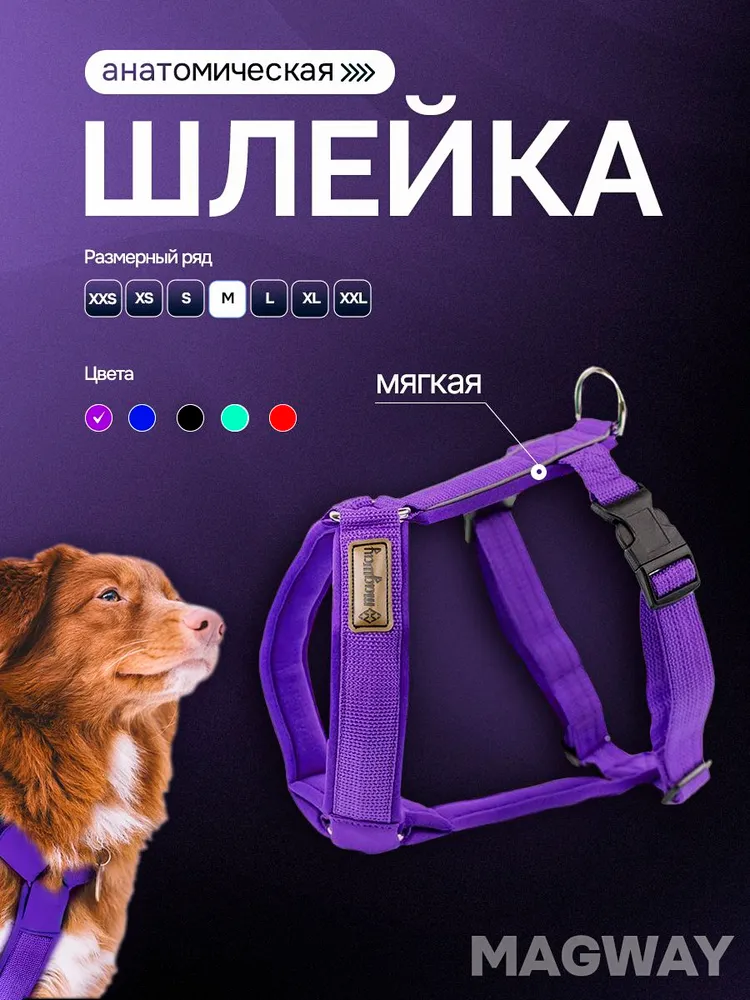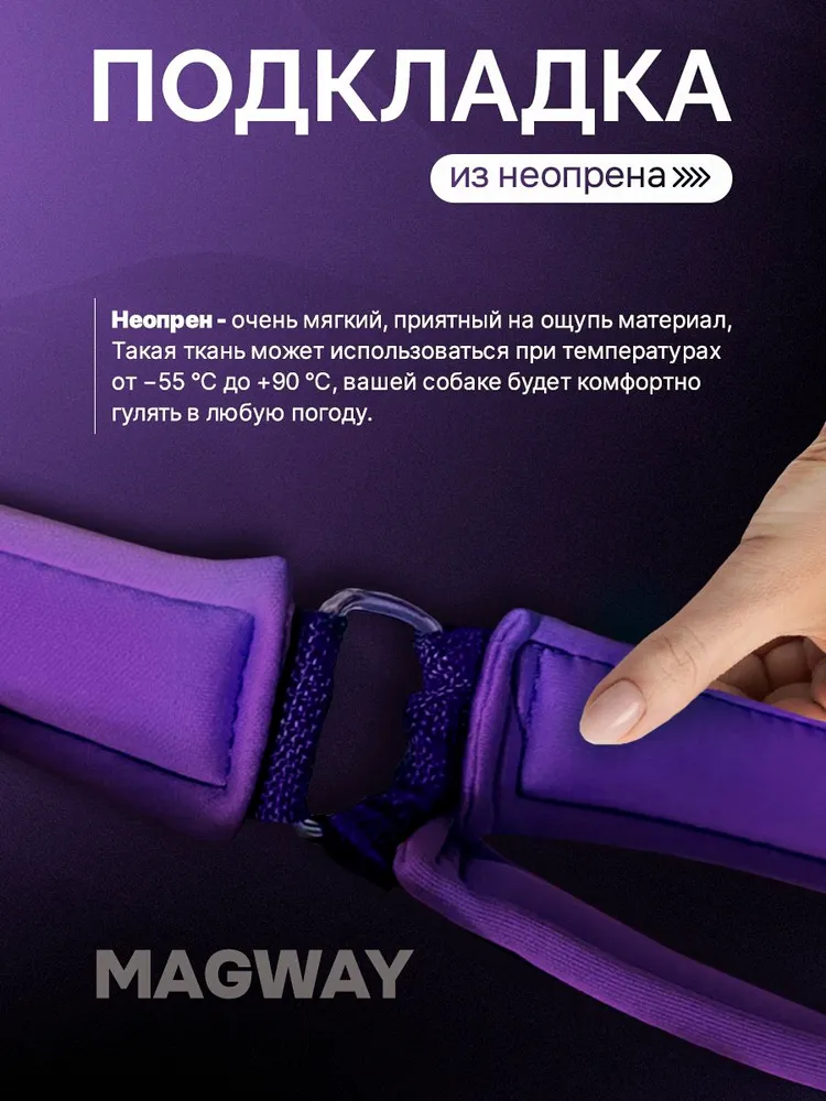 Прогулочная шлейка на неопрене — идеальное сочетание удобства, безопасности и стиля для вашей собаки.Бренд MagWay позаботился обо всех деталях, чтобы создать аксессуар, который станет незаменимым в повседневной жизни и активных занятиях с вашим питомцем.Что делает эту шлейку незаменимой?Абсолютный комфорт: мягкий и гипоаллергенный неопрен предотвращает раздражения и натирания, даже при длительных прогулках или интенсивных тренировках.Эргономичный дизайн: Y-образный перед и H-образный верх обеспечивают правильное распределение нагрузки, исключая давление на шею и позвоночник. Это особенно важно для активных собак и питомцев с чувствительным телосложением.Надежная фиксация: прочные металлические кольца спрятаны в подкладку, что исключает риск случайного травмирования собаки или повреждения шерсти.Светоотражающие элементы: для вашей безопасности в темное время суток — лучшее решение для прогулок в условиях недостаточной видимости.Подходит для любых активностей: идеальна для повседневных прогулок, дрессировок, занятий спортом или долгих походов.Практичность и долговечность:Легкость в уходе: шлейка выдерживает машинную стирку, сохраняя форму и цвет. Ее достаточно постирать в машинке на деликатном режиме при температуре 30°C.Высококачественные материалы: износостойкие стропы и надежные элементы фурнитуры гарантируют длительное использование даже при интенсивной нагрузке.Устойчивость к погодным условиям: материалы не впитывают влагу, быстро сохнут и не теряют своих свойств под дождем или снегом.Почему стоит выбрать именно эту шлейку?Подходит для собак всех пород и размеров благодаря универсальному дизайну и доступным размерам.Это не просто аксессуар, а надежный помощник для комфортного взаимодействия с вашим питомцем.Вы инвестируете в здоровье и безопасность вашей собаки, выбирая аксессуар, который учитывает анатомические особенности и потребности активных питомцев.