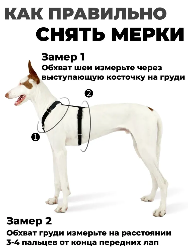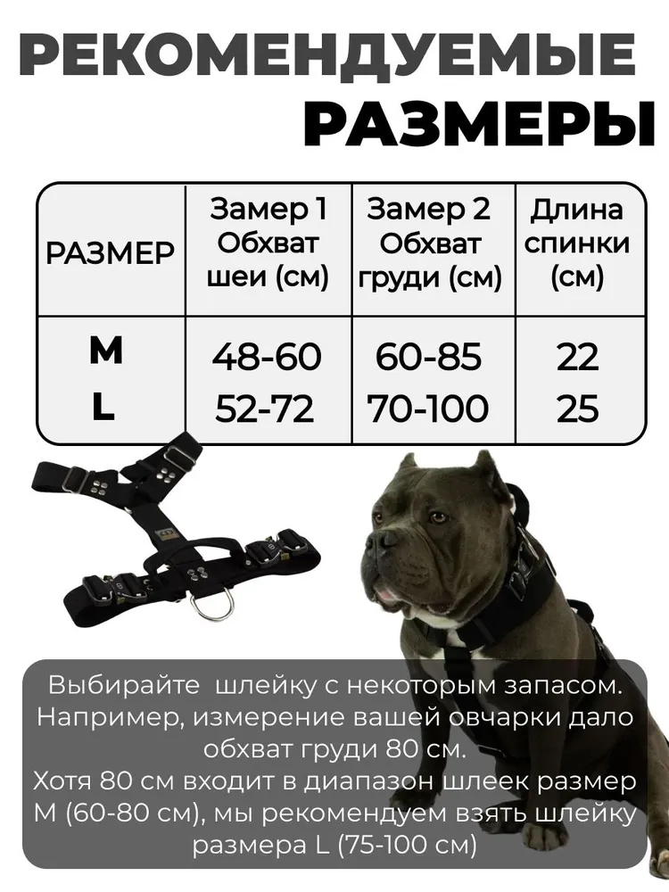 Перед заказом измерьте вашу собаку, чтобы определить размер:Замер 1. Обхват от холки до киля (выпирающая косточка на груди).Замер 2. обхват груди за передними лапами на расстоянии 3-4 пальцев от подмышек.Схема замеров представлена на фото.Выбирайте шлейку с некоторым запасом. Например, измерение вашей овчарки дало обхват груди 80 см. Хотя 80 см входит в диапазон шлеек размер M (60-80 см), мы рекомендуем взять шлейку размера L (70-100).Примерное распределение размеров по породам:Размер М: Золотистый ретривер, Лабрадор, Боксер, Венгерская выжла, Западносибирская лайка, Самоедский шпиц, Сибирский хаски, Австралийская овчарка, Шар-пей, Энтлебухер зенненхунд, Американский стаффордширский терьер, Английский бульдог, Американский булли.Размер L: Веймаранер, Ротвейлер, Немецкая овчарка, Доберман, Русский чёрный терьер, Ирландский волкодав, Американский бульдог, Американская акита, Ризеншнауцер, Родезийский риджбек, Дратхаар, Аргентинский дог, Аляскинский маламут, Белая швейцарская овчарка, Бельгийская овчарка, САО, Бернский зенненхунд, Кавказская овчарка, Кане-корсо, Московская сторожевая собака, Ньюфаундленд, Сенбернар, Тибетский мастиф.