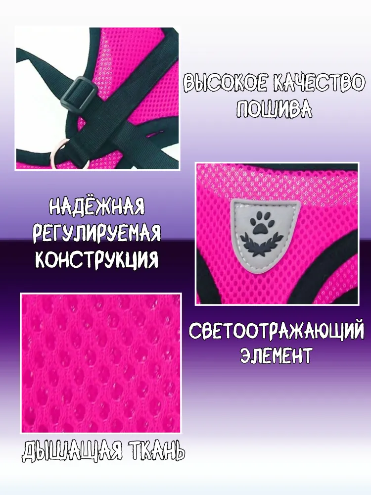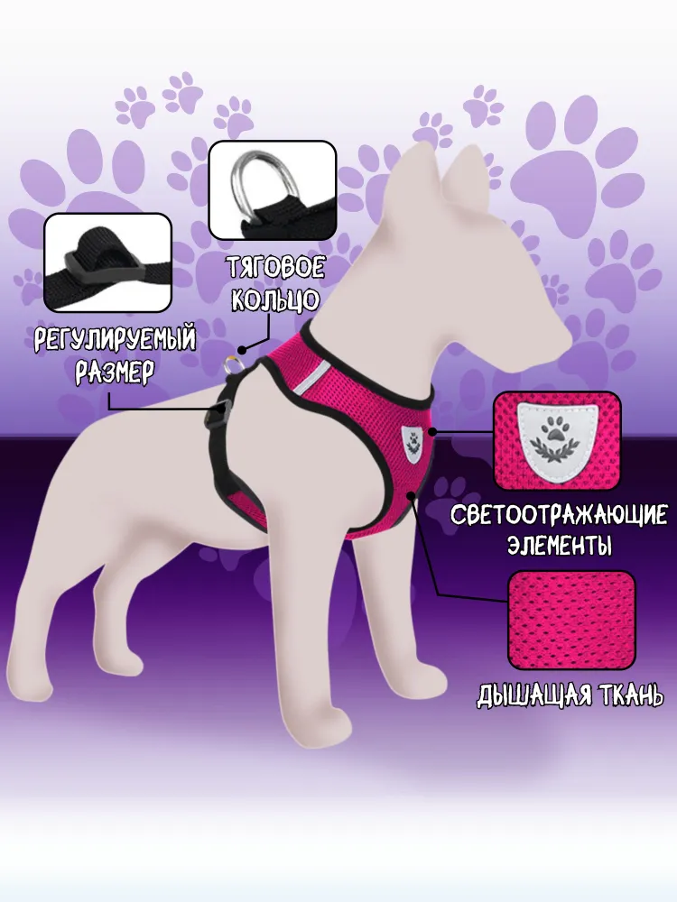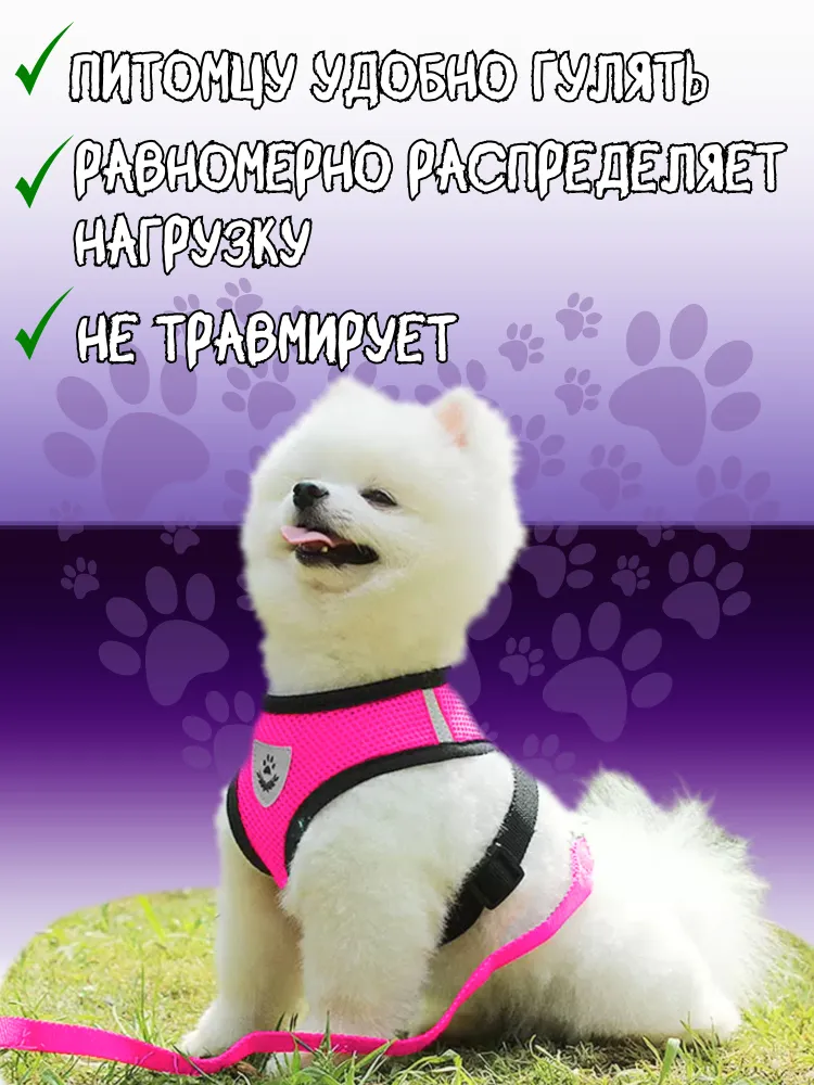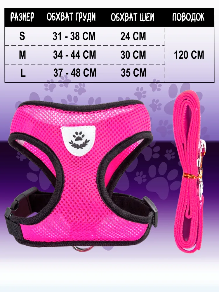 Прогулочная шлейка для кошек и щенков, для собак мелких или средних пород - отличная альтернатива ошейнику, удобный аксессуар, который сделает прогулку комфортной и для питомца, и для владельца.Изделие анатомической формы создано из мягкой и дышащей ткани, его отличает утолщенная и мягкая окантовка для комфортного прилегания, сетчатая структура для отличного воздухообмена, надежная фурнитура из нержавеющей стали. Универсальный аксессуар дополнен поводком - ремнем длиной 130 см, светоотражающим мини - элементом на внешней части. Размер шлейки для повседневных прогулок регулируется, а головки пряжки - держателя утолщены. Нагрудная жилетка из текстильного материала - сетки подойдет и для котенка, и для взрослого животного, и для крупного мейн - куна и для маленькой собачки - йоркширского терьера.Мягкая шлейка подойдет для размеренной прогулки или быстрых пробежек (беговых тренировок) на улице, на даче, во время прогулки по лесу или парку.