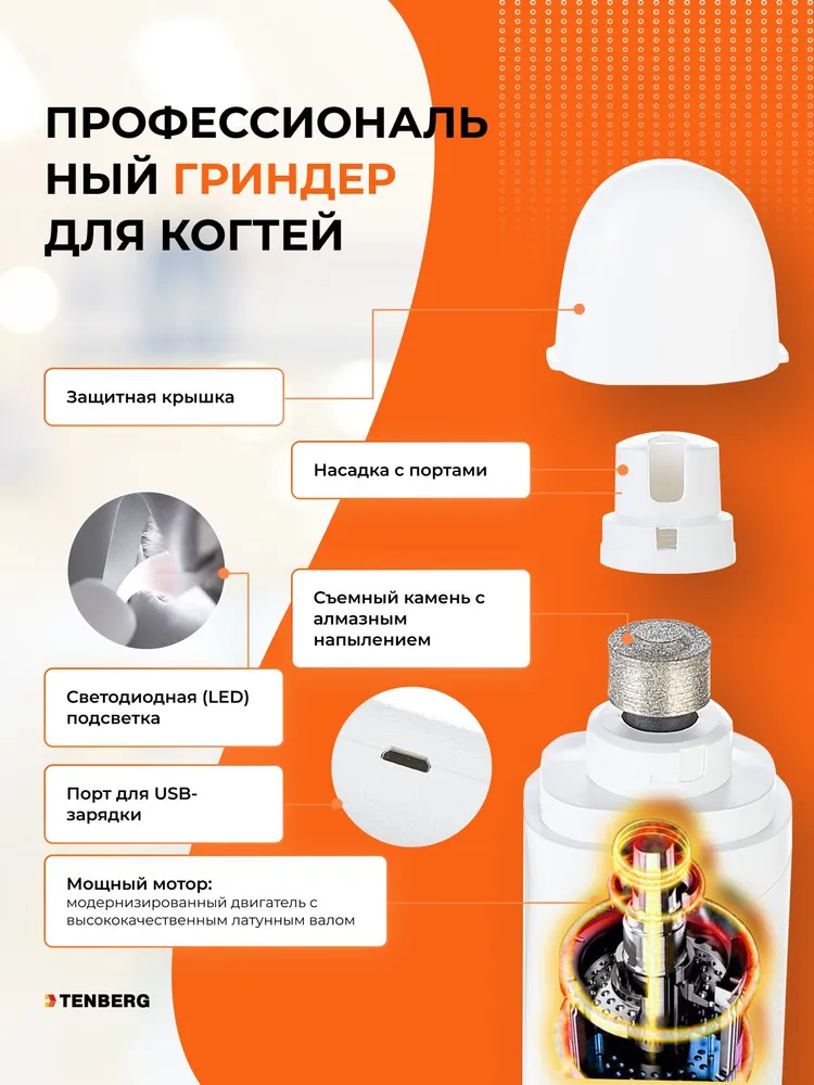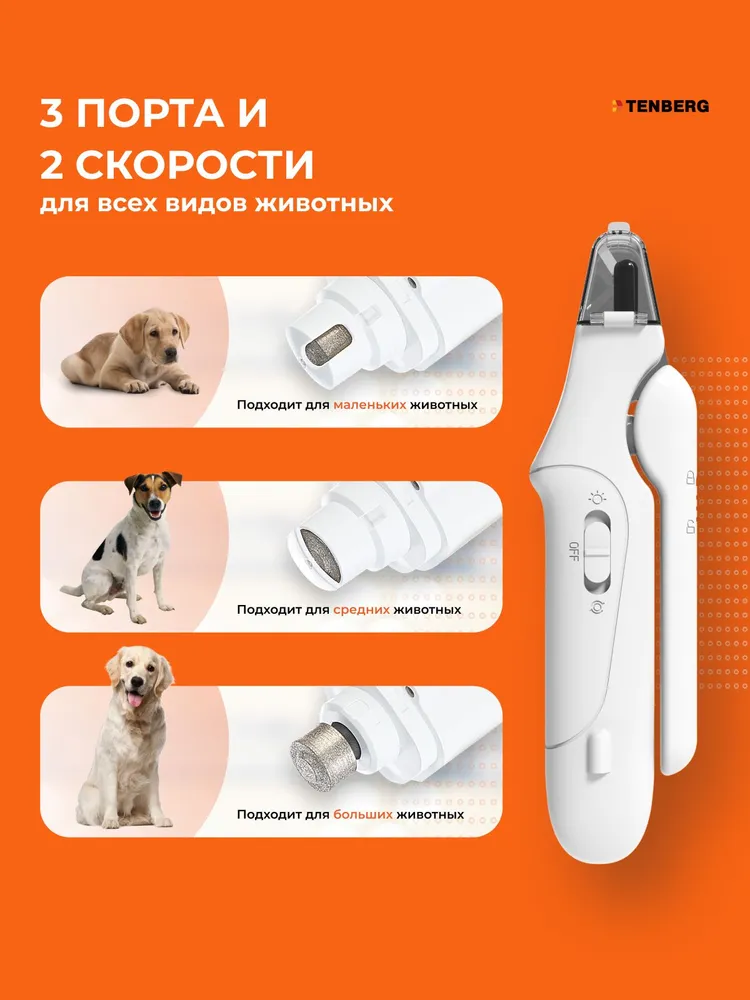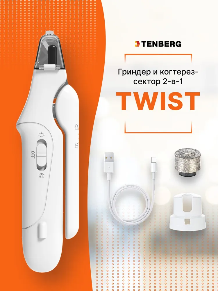 Гриндер и когтерез-секатор 2-в-1 для собак и кошек Tenberg Twist обеспечит точный срез и безопасную полировку когтей. Гриндер для животных за счет съемной насадки подходит для обточки когтей у всех типов собак и кошек. Когтерез с LED-подсветкой подходит для подрезания когтей у всех типов животных (кроме крупных пород собак).● Яркая светодиодная LED-подсветка с идеальным углом освещения пульпы когтя (кровеносных сосудов и нервов) *● Встроенный гриндер для когтей● Съемный колпачок с двумя отверстиями для разных вариантов обработки когтя● Тихий (до 40 д