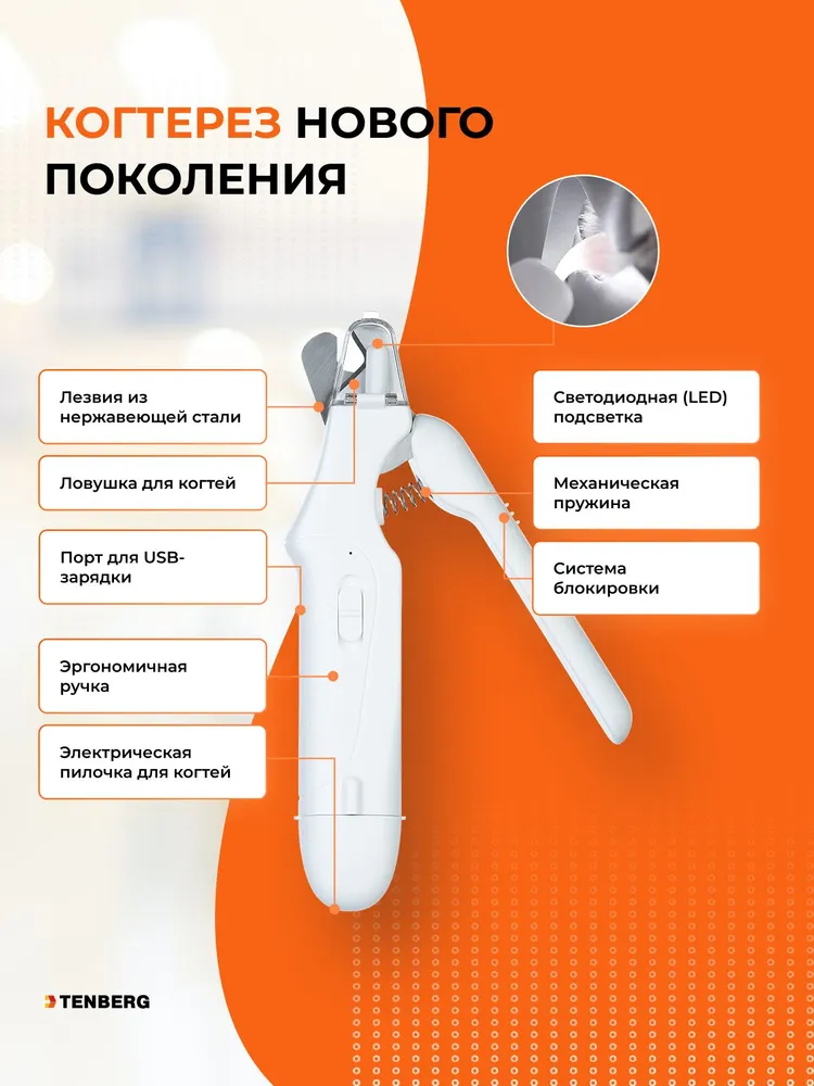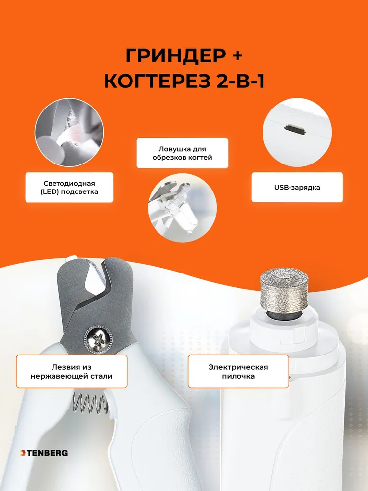Гриндер и когтерез-секатор 2-в-1 нового поколения Tenberg Twist - это самый безопасный на сегодняшний день способ ухода за когтями питомца. За счет яркой LED подсветки видны нервные окончания и капилляры *, а острое лезвие срезает точно и плавно. Встроенный гриндер тихо и безопасно отполирует коготь, сделав его круглым и аккуратным. Обрезки от когтей попадают в специальную ловушку. Больше не нужно собирать обрезки по всему полу!* Светодиодная (LED) подсветка может меньше освещать темные и черный когти.