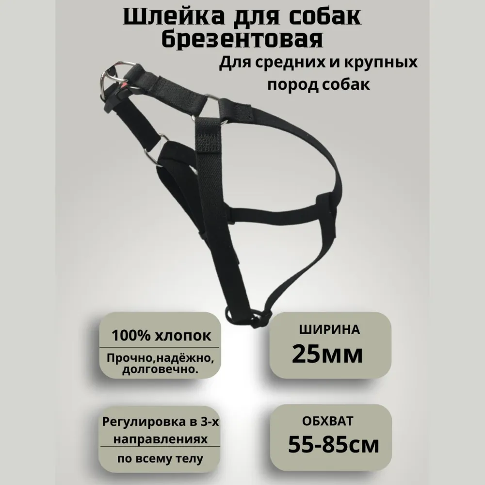 Шлейка для собак Ширина стропы - 25 мм. Обхват шеи и груди - 55-85 см.Шлейка предназначена для собак крупных и средних пород. Шлейка – отличная альтернатива ошейнику. Регулируется абсолютно везде с помощью удобных пряжек - по шее, по груди, вдоль груди. За счет этого подходит для любых собак крупных и средних пород. Замок фастекс оснащен фиксатором, благодаря которому шлейка не расстегнется даже во время активных игр. Материал изделия – брезент отечественного производства 100% х/б. Это прочный, износостойкий и долговечный материал, не требующий особого ухода. Он мягкий и безопасный для питомца. Шлея укомплектована двумя полукольцами для крепления карабина. Полукольца сварные. Правильно подогнанная шлейка не стесняет движения питомца, не натирает кожу, поэтому животное чувствует себя в ней уверенно и комфортно. Изделие отличается высоким качеством, удобством и универсальностью.Сделано в РФ. Техпро44