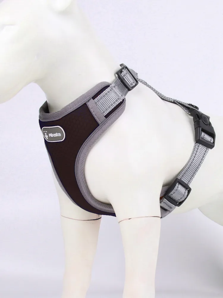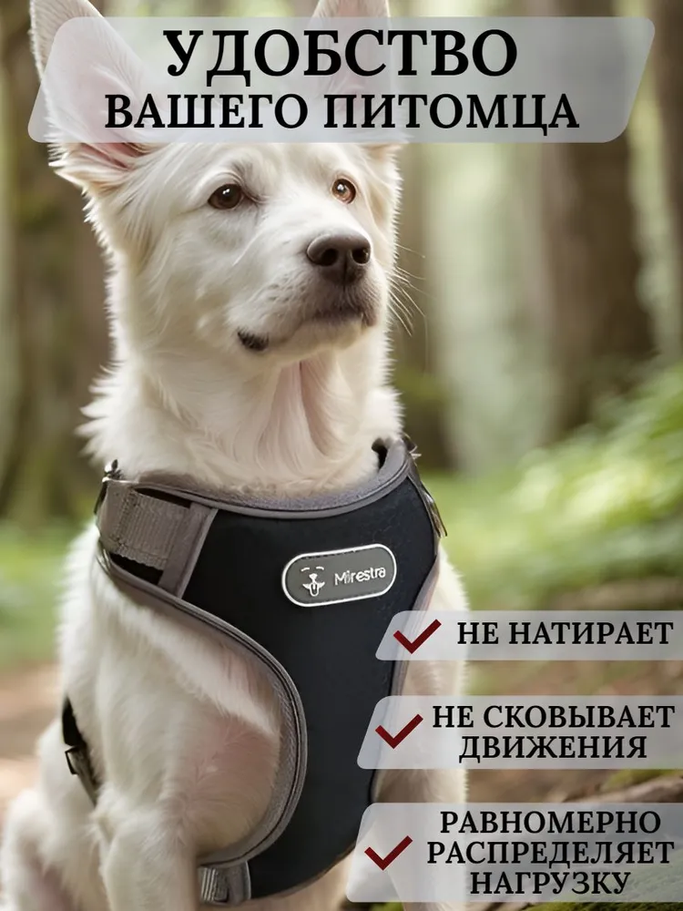 Шлейка прогулочная сделана из высокотехнологичных материалов с мягкой подкладкой из неопрена, имеет эргономичную форму, которая переносит рывковое усилие Вашей собаки на грудь, не задействуя шею. Шлейка удобная, дышащая, анатомически правильная, обеспечивает максимальный комфорт питомцу, она легко расстегивается и застегивается благодаря удобным и простым в использовании застежкам, позволяя быстро и удобно снять шлейку с питомца. Отлично подгоняется по размеру. Застежка-фастекс обладает блокировкой от случайного открытия, не позволяя питомцу сорваться во время прогулки. Поводок крепится к кольцу из нержавеющей стали на спине. Предназначена для комфортного, повседневного и безопасного выгуливания собаки, она может быть использована во время прогулок и тренировок как альтернатива ошейнику, во время дрессировок, а также для безопасной перевозки питомца в автомобиле. Содержит светоотражающие элементы для безопасных прогулок в вечернее и ночное время. Подойдет для собак мелких, средних и крупных пород. Шлейка выпускается в четырех размерах : S, M, L, XL. Для точного выбора размера рекомендуем воспользоваться размерной таблицей на втором фото. Если нет возможности измерить обхват груди питомца - ориентируйтесь на отзывы наших покупателей. Шлейка очень проста в уходе - ее можно стирать в машинке без использования отбеливателя. Сушить на открытом воздухе без использования батареи или полотенцесушителя. Шлейка выполнена в разнообразных цветовых вариантах, поэтому Вы сможете подобрать подходящую по эстетике модель. Поводок в комплект не входит. Mirestra - лидирующий бренд товаров для животных. В нашем магазине Вы сможете подобрать зоотовары на любой вкус. Мы предоставляем нашим клиентам только самую лучшую амуницию для прогулки и дрессировки (шлейки, ошейники, поводки), игрушки для собак, кошек, котов, щенков и птиц. Подходит для владельцев популярных пород собак: лабрадор-ретривер, золотистый ретривер, сибирский хаски, джек рассел терьер, той терьер, немецкая овчарка, алабай, французский бульдог, мопс, такса, доберман, пудель, ротвейлер, бигль, корги, самоед, цвергшнауцер, сенбернар, эрдельтерьер, бультерьер, стаффорд, шпиц и многих других. Качественная, удобная и безопасная шлейка - настоящий подарок, который Вы можете сделать своему четвероногому другу.