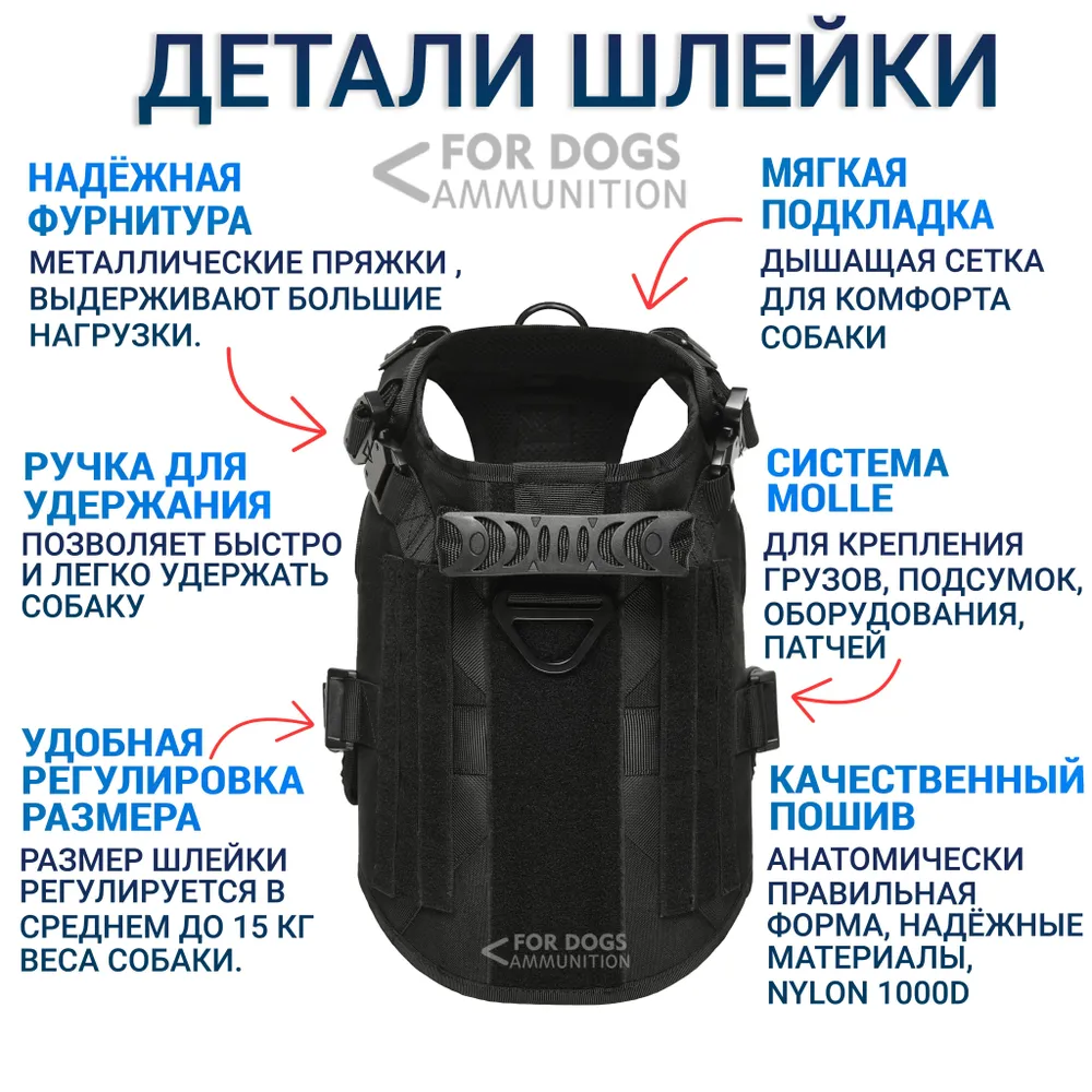 Быстросъёмная металлическая пряжка . Надёжное решение , для самых энергичных собак .Представляем шлейку специального назначения для разных пород собак . Данная амуниция для собак создаёт комфорт при эксплуатации и обеспечивает максимальную безопасность во время занятий спортом и повседневных прогулок с собакой .О надежности тактических шлеек :Амуниция сделана с использованием передового оборудования и качественных материалов. Шлейки изготовлены из 1050D нейлоновой и водостойкой ткани , а так же 100% нейлоновая нить и тесьма. Важно в тактических шлейках используются металлические пряжки , позволяющие выдерживать высокие нагрузки в наиболее напряженных частях плечевого ремня. Крепкое металлическое v-образное кольцо сзади и металлическое d-кольцо спереди.О комфорте амуниции :Данная шлейка это более правильная альтернатива ошейнику .Именно такой пошив (треугольник) позволяет равномерно распределять нагрузку по всему телу собаки. Система сделана таким образом что при рывке собака себя не душит , а при ходьбе или беге , собака не чувствует дискомфорт .Так же конструктивной особенностью являются регулируемые длинные ремни , включая нижнюю часть. Регулировка строп позволяет приобрести амуницию на вырост, это отличная возможность ограничится одной шлейкой на случай если собака наберет еще 10-15 кг веса. Внутренняя часть шлейки имеет вентилируемую , мягкую стеганую подкладку.Для каких пород подходит амуниция ? Ответ прост - для всех!Если Ваш любимец вписывается в размеры шлеек , это несомненно станет лучшим решением .Спасибо за Ваш выбор !