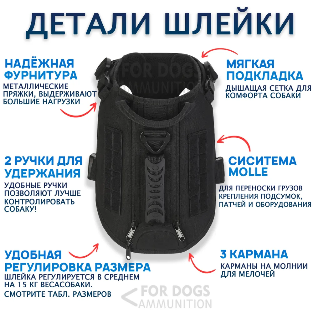 Представляем шлейку специального назначения для разных пород собак . Данная амуниция для собак создаёт комфорт при эксплуатации и обеспечивает максимальную безопасность во время занятий спортом и повседневных прогулок с собакой .О надежности тактических шлеек :Амуниция сделана с использованием передового оборудования и качественных материалов. Шлейки изготовлены из 1050D нейлоновой и водостойкой ткани , а так же 100% нейлоновая нить и тесьма. Важно в тактических шлейках используются металлические пряжки , позволяющие выдерживать высокие нагрузки в наиболее напряженных частях плечевого ремня. Крепкое металлическое v-образное кольцо сзади и металлическое d-кольцо спереди.О комфорте амуниции :Данная шлейка это более правильная альтернатива ошейнику .Именно такой пошив (треугольник) позволяет равномерно распределять нагрузку по всему телу собаки. Система сделана таким образом что при рывке собака себя не душит , а при ходьбе или беге , собака не чувствует дискомфорт .Так же конструктивной особенностью являются регулируемые длинные ремни , включая нижнюю часть. Регулировка строп позволяет приобрести амуницию на вырост, это отличная возможность ограничится одной шлейкой на случай если собака наберет еще 10-15 кг веса. Внутренняя часть шлейки имеет вентилируемую , мягкую стеганую подкладку.Для каких пород подходит амуниция ? Ответ прост - для всех!Если Ваш любимец вписывается в размеры шлеек , это несомненно станет лучшим решением .
