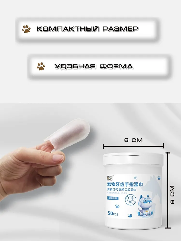 Влажные антибактериальные салфетки — это удобный способ ухода за питомцем. Удобные салфетки для чистки зубов животных имеют форму напальчников и благодаря эргономичной форме салфетка не будет скручиваться и выпадать из рук во время процедуры. Это позволит организовать процесс груминга комфортным для вас и не вызовет отвращения и агрессии к процессу у вашего любимого питомца.. Влажные салфетки напальчники станут вашим незаменимым помощником в процессе гигиены полости рта вашего питомца,, с их помощью вы легко сможете предотвратить появление зубного камня у животных, они так же подходят для протирания глаз и слезных дорожек, отлично справятся с загрязнениями в ушах ваших любимцев. Все салфетки изготовлены из гипоаллергенных материалов и не содержат вредных химических добавок, что делает их безопасными для вашего питомца.Здоровый питомец – счастливый хозяин!