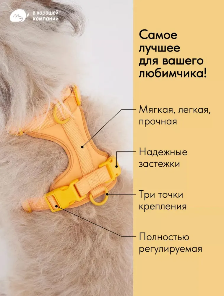 Прогулочная шлейка - необходимый аксессуар для комфортной и безопасной прогулки ваших домашних питомцев. Анатомическая и воздушная шлейка станет незаменимым помощником при выгуле ваших любимцев в городе или в парке. Универсальная шлейка размера М подходит для маленьких щенков крупных пород, для средних и мелких взрослых животных. Удобная конструкция с прочными креплениями в виде трех колец обеспечивает надежную фиксацию, регулировка на шее и груди не сковывает движения и не давит на грудной отдел. Переднее кольцо подходит для собак, которые тянут, а задние кольца для обученных ходить с одной ноги со своими родителями. Качественные застежки позволяют быстро надевать и снимать изделие.\nВыполнена из дышащего, мягкого материала и сетчатой ткани внутри, что позволяет животному чувствовать себя спокойно даже во время длительных прогулок. Шлейка жилетка улучшает коммуникацию с питомцем и облегчает его поведение на улице. Яркая зеленая расцветка добавит стильности и свежести в образ вашего четвероногого друга. Не откладывайте заботу о комфорте и безопасности вашего питомца на второй план. Позвольте вашему любимцу насладиться свежим воздухом и активными играми под вашим чутким контролем вместе с IN GOOD COMPANY.