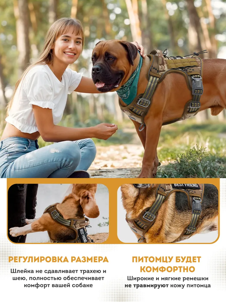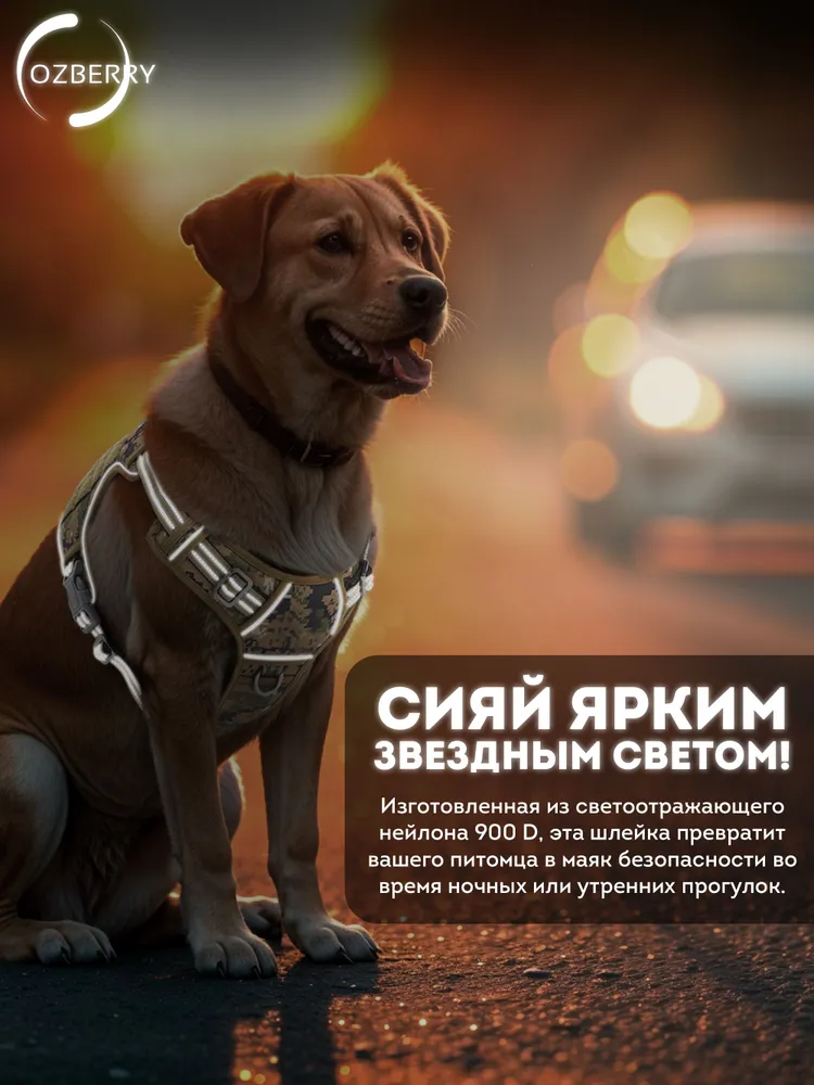 МНОГОФУНКЦИОНАЛЬНАЯ ШЛЕЙКАпредназначена для безопасного и комфортного выгуливания и дрессировки вашей собаки. Тактическая экипировка, которая позволяет вам заниматься спортом и ходить в походы вместе с вашим питомцем. Также шлейка для собак – замечательная альтернатива ошейнику.РАЗМЕР. Подойдет для собак с параметрами:Охват по груди: 55-83 см.Обхват шеи: 40-55 см.Примерный вес: 13-22 кг.ВЫСОКОЕ КАЧЕСТВОАнатомическая собачья шлейка от бренда OZBERRY выполнена из высокотехнологичного материала. Сверхпрочный, легкий и водостойкий нейлон плотностью 900 D прошит надежной строчкой с двух сторон.ПРОДУМАННАЯ КОНСТРУКЦИЯ. Тактическая военная шлейка для собак содержит 4 ремня (2 плечевых и 2 нагрудных). Они обеспечивают плотную посадку и максимальную мобильность. Ремни регулируются. На жилете есть светоотражающие элементы и табличка для информации о собаке, для безопасности вашего питомца во время прогулки. Материал легко очищается и моется. Крепкое кольцо и ручка смогут удержать вашего питомца при рывках, не травмируя шею собаки, а вас уберечь от травм рук.ПРОДУМАННАЯ КОНСТРУКЦИЯТактическая военная шлейка для собак содержит 4 ремня (2 плечевых и 2 нагрудных). Они обеспечивают плотную посадку и максимальную мобильность. Ремни регулируются. На жилете есть светоотражающие элементы и табличка для информации о собаке, для безопасности вашего питомца во время прогулки. Материал легко очищается и моется. Крепкое кольцо и ручка смогут удержать вашего питомца при рывках, не травмируя шею собаки, а вас уберечь от травм рук.БЕЗОПАСНОСТЬ И КОНТРОЛЬ. Специальная прочная ручка жилета помогает обезопасить вашу собаку в момент сдерживания. Удобные пряжки и регулируемые ремни обеспечивают полную и надежную посадку жилета на собаке. Наш ошейник для собак подходит для средних и крупных пород. Мягкая подкладка служит для защиты от любых нагрузок и для защиты кожи вашей собаки, а дышащая воздушная сетка обеспечивает комфорт. Шлейка крепко обхватывает шею, грудь и часть спины пса, позволяя ему легко передвигаться, не сковывая движений. К жилету можно прикрепить игрушки и другие необходимые вещи при помощи липучек для крепления аксессуаров, а также регулируемых подвязок для крепления груза. Поводок для собак крепится к кольцу на спине.РАЗНООБРАЗИЕ ПРИМЕНЕНИЯШлейка для собак крупных пород идеально подойдет для личного использования, для правоохранительных органов, охоты, походов, путешествий и профессиональных тренировок с вашим любимым питомцем. А также предназначена для работы по защитным курсам дрессировки.Купить Шлейку для собаки от бренда OZBERRY — значит выбрать действительно качественный товар! При создании нашей продукции мы стремимся к достижению максимально высокого качества с сохранением выгодных для покупателя цен. Будем искренне благодарны вам за отзыв о нашем товаре!
