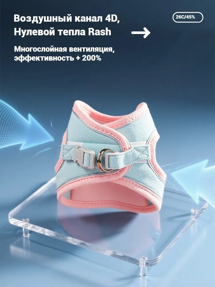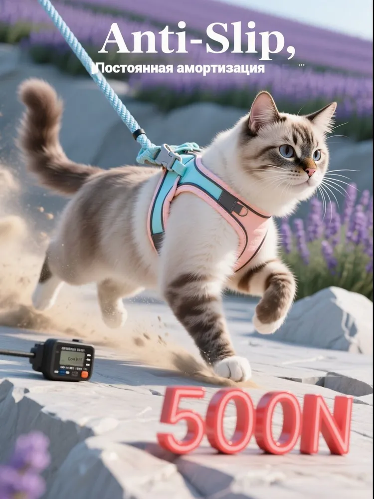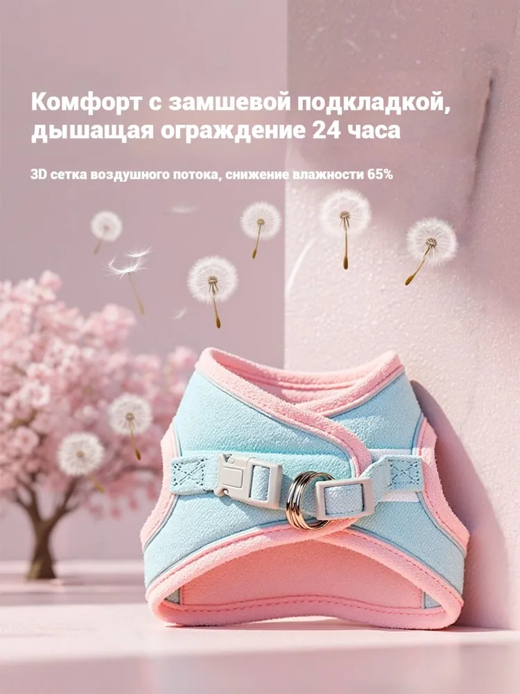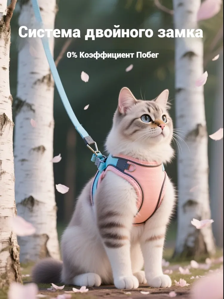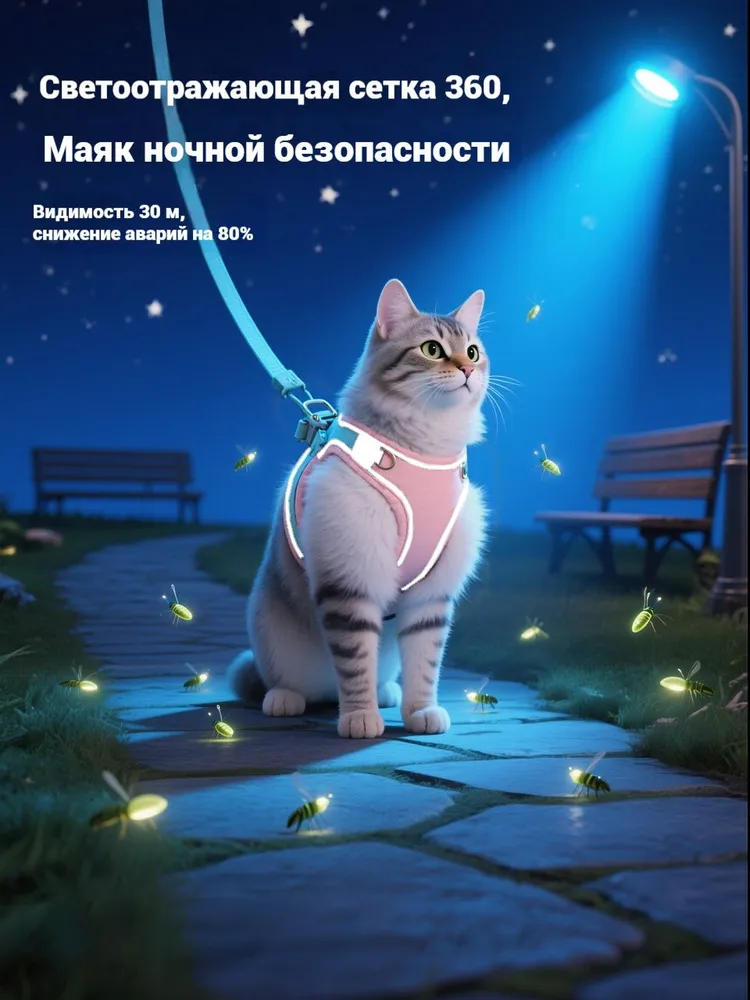 Мягкая шлейка для котят с поводком 1.5м светоотражающими элементами. Специально разработана для котят и кошек весом 1-6 кг. Дышащий материал предотвращает натирание, а эргономичная конструкция обеспечивает комфорт на прогулке.