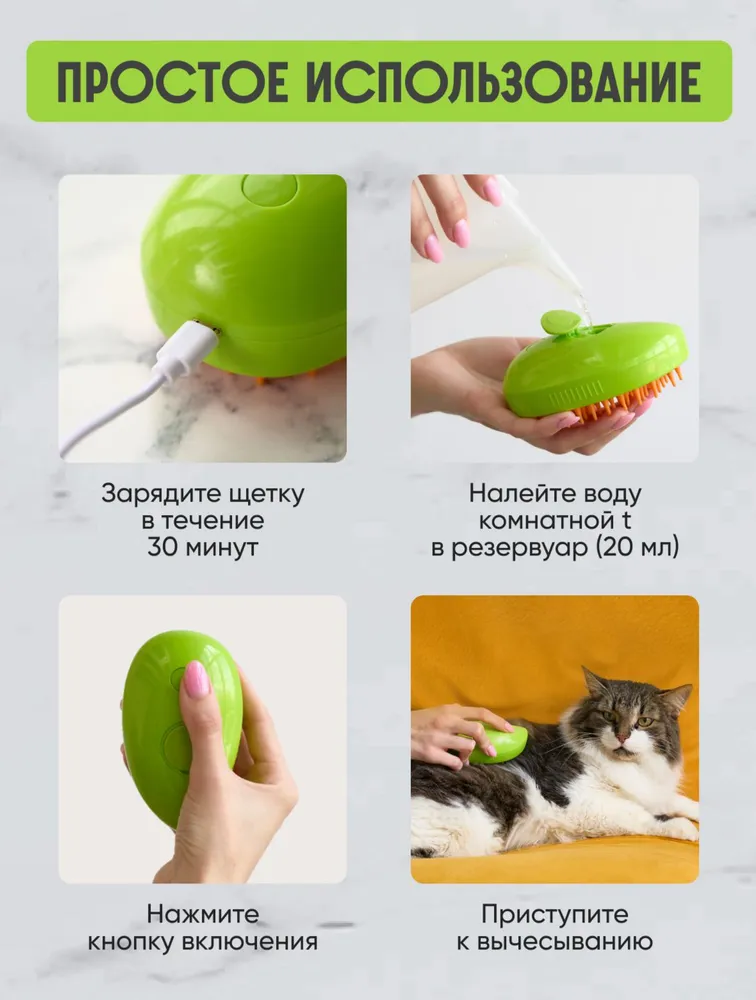 Аккуратно расчёсывайте шерсть питомца. Холодный пар мягко увлажняет и облегчает процесс вычёсывания. После использования выключите устройство и слейте остатки воды из резервуара.Простая и удобная конструкция делает уход за питомцем комфортным и эффективным!