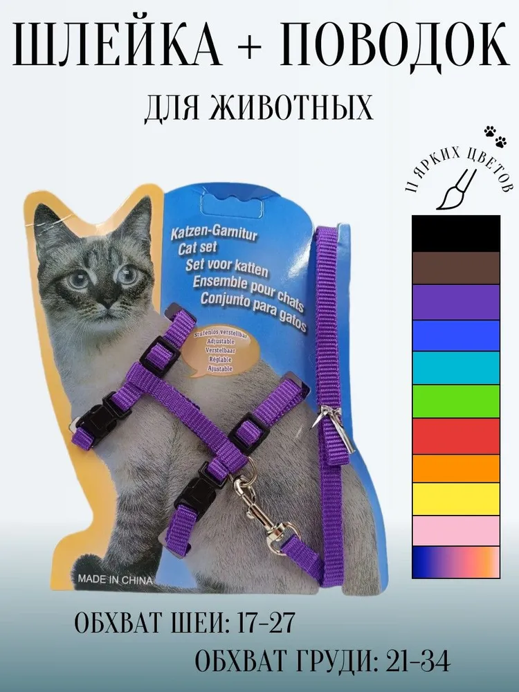 Прогулочная нейлоновая шлейка с поводком, идеально подходящая для кошек, щенков, мелких пород собак и даже кроликов. Этот аксессуар отличная альтернатива ошейнику, станет надежным спутником для прогулок на свежем воздухе, обеспечивая комфорт и безопасность вашему питомцу.Надежная и прочная