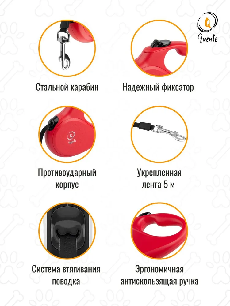 Поводок - рулетка для животных от Quente - отличный выбор!Сделан специально для России: ударопрочный немаркий пластик, выдерживает температуры от -50С до +50СНадежная лента длиной 5 метров позволит вашему питомцу свободно бегать.Фирменная система фиксации надежно держит поводок, если нужно и легко отпускается.Эргономичная ручка с антискользящим покрытием9 цветов на выбор - каждый найдет себе по душе!Гарантия качества!Каждая деталь поводка - рулетки Quente изготовлена их качественных материалов и послужит вам долго!Сделано для России!Мы специально разработали эти модели для России. Они выдерживают ударные нагрузки, холода и жару, немаркие и надежные. Описание на русском языке.Выбор цветов на любой вкус!Если вы хотите выделить своего питомца на улице - мы позаботились и об этом! На ваш выбор 9 расцветок - каждый найдет свое!Товары для собак от QuenteМы также предлагаем другие товары качественные для собак от Quente!* Для просмотра кликните на фото