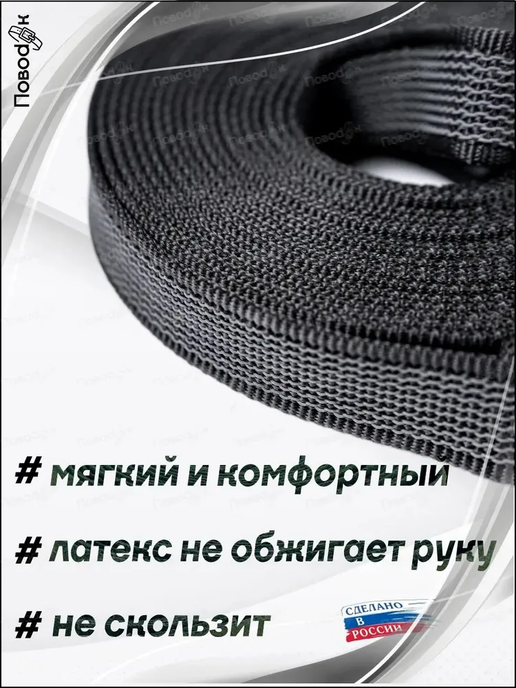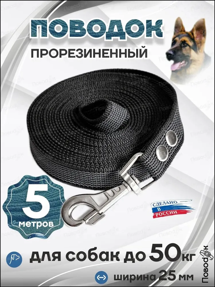 Поводок для собак прорезиненный с латексной нитью. Мягкий и комфортный. Очень удобный и не скользит в руке. Длина 5 метров. Ширина 25 мм, приблизительное ограничение по весу до 50кг. Выполнен из качественных износостойких материалов. Оптимальный размер отлично подходит для выгула, дрессировки и привязи больших и средних собак и щенков крупных пород. Поводок обладает неоспоримыми преимуществами перед остальными типами поводков. Безопасный для кожи и шерсти активных питомцев. Ручка-петля обеспечивает удобный хват, материал прорезиненной стропы прочный и долговечный, легко стирается и прост в уходе, увеличенный карабин-вертлюг предназначен для препятствия закручиванию поводка и уменьшению травмирования руки. Для увеличения срока службы амуниции и других товаров для животных регулярно просушивайте или протирайте поводок после использования в дождливую и грязную погоду. Поводки с латексной нитью подходят в использовании для собак крупных пород, средних и мелких пород и размеров.
