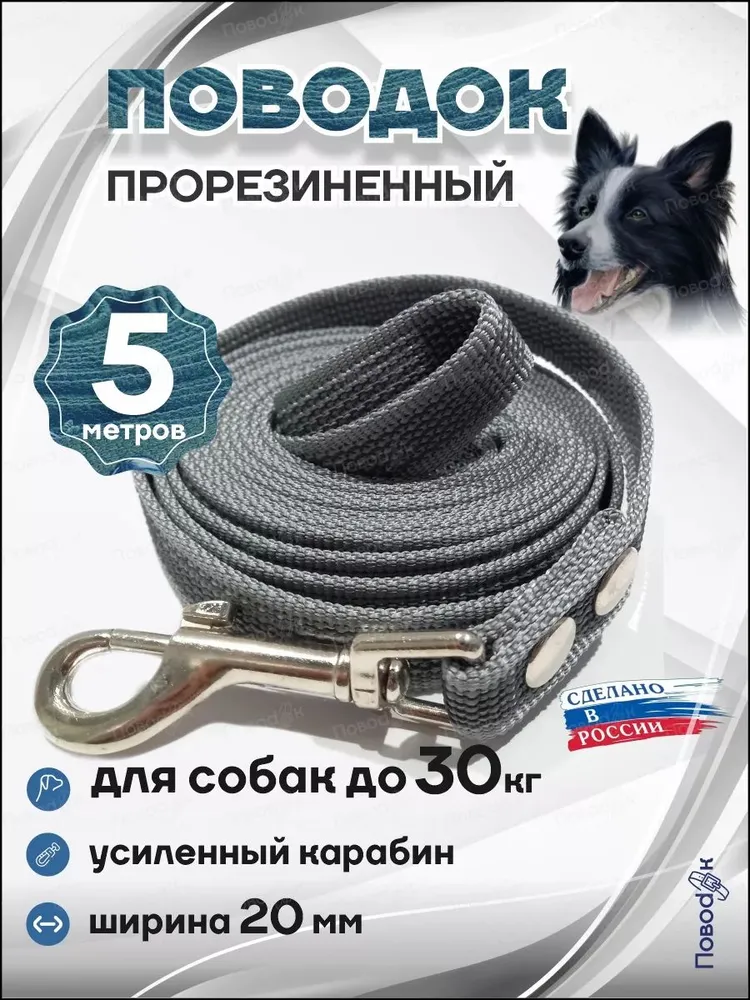 Поводок для собак средних и мелких пород прорезиненный с латексной нитью. Мягкий, лёгкий и комфортный. Очень удобный, красивый и не скользит в руке. Не промокает и легко отстирывается. Длина 5 метров. Ширина 20 мм. Приблизительное ограничение по весу до 30кг. Выполнен из качественных износостойких материалов. Оптимальный размер отлично подходит для выгула и дрессировки средних и маленьких собак и щенков всех пород. Также подходит для спортивных и кинологических занятий и для контроля во время посещения выставок. Безопасный для кожи и шерсти активных питомцев. Ручка-петля обеспечивает удобный хват, материал прорезиненной стропы прочный и долговечный, легко стирается и прост в уходе, металлический карабин-вертлюг с вращением на 360 градусов предназначен для препятствия закручиванию поводка и уменьшению травмирования руки. Для увеличения срока службы амуниции и других товаров для животных регулярно просушивайте или протирайте поводок после использования в дождливую и грязную погоду. Поводки с латексной нитью подходят в использовании как для собак мелких пород, таких как мопс, йорк, французский бульдог и т.п. так и для собак средних пород и размеров, например, сиба-ину, спаниель, пудель, терьер, лайка, такса и т.п. В размерной линейке всегда в наличии поводки, прошитые латексной нитью, длиной 3м и 5 м.