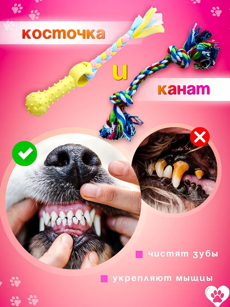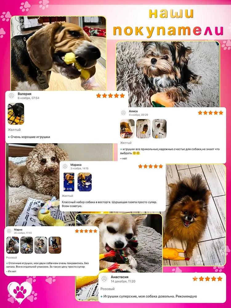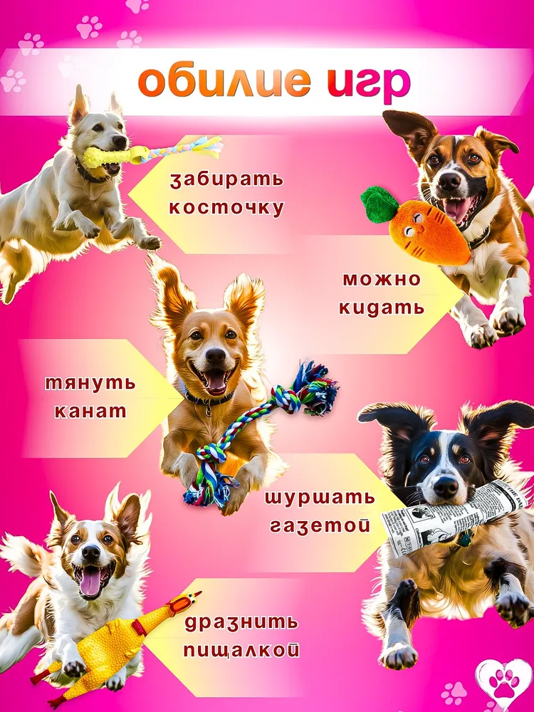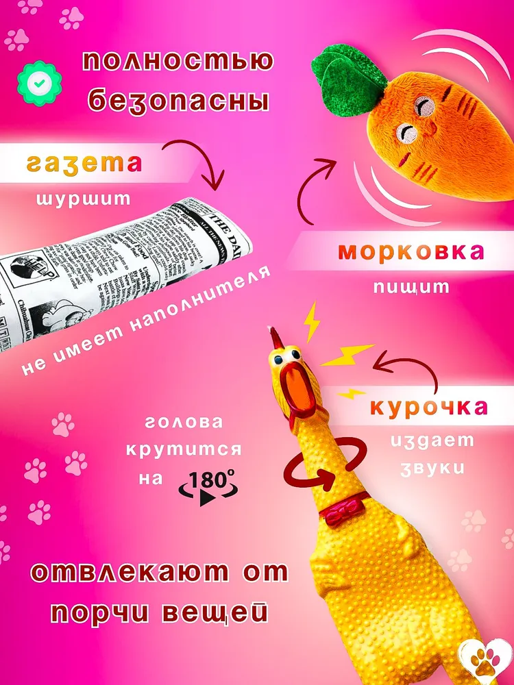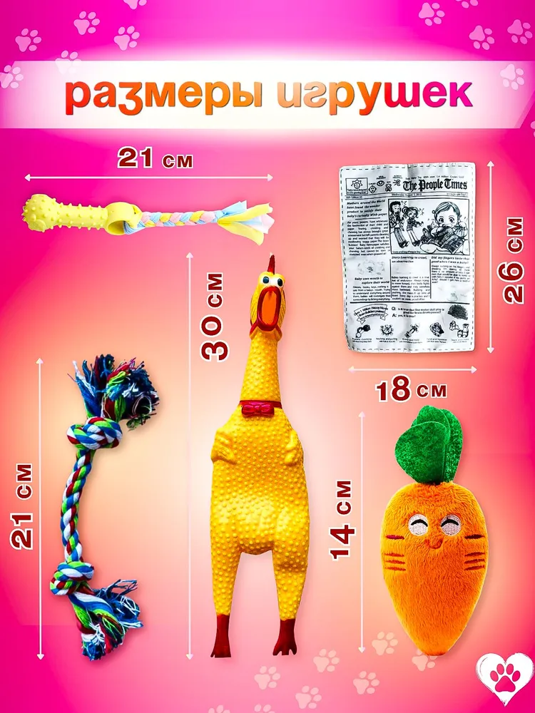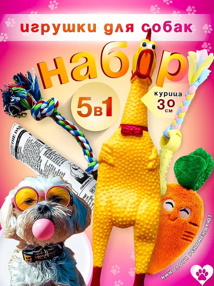Игрушки для собак - это лучшее решение для ваших питомцев. Вы будете спокойны за своего четвероногого друга, купив набор игрушек для собак, который отлично подойдет не только для активных игр и дрессировки, но и просто послужит заменителем вашей обуви в виде зоотоваров для собак.Игрушки для собак мелких пород и щенков выполнены из безопасных гипоаллергенных материалов и не имеют каких-либо посторонних химических запахов. Для производства использовался 100% хлопок и высоко качественной резины (аналог силикона и латекса), что делает игрушки для животных особенно долговечными.Набор 5 в1 состоит из:1.Курица игрушка для собак длинной 30см. Курица пищалка представляет собой интерактивную дразнилку, способную порадовать не только вашего питомца, но и вас самого.2.Мягкая «антивандальная» игрушка газета шуршалка для собак - обязательно порадует Вашего питомца, ведь она создана для долгих игр. Игрушки для мелких пород собак выполнены из прочной спецткани . Игрушка для щенка не имеет вышитых элементов и внешней фурнитуры, что делает развивающие игрушки для собак абсолютно безопасными для здоровья собаки и кошки.3.Игрушечная массажная кость с канатиками 20см. Резиновая игрушка для собак имеет специальные мягкие шипы, которые чистят и прорезывают зубы, массажируя десна и обеспечивая гигиену полости рта. Идеальный грызак для собак.4.Высокопрочный канат 23 см, подойдет для игры собачки в перетяжки а также выполнит роль дразнилки и кусалки. Служит как грызунок для собак. Идеальная канатная веревка5.Мягкая морковка - пищалка. прекрасно снимет антистресс и заменит ваши домашние тапочки. Товары для животных подходят по размеру щенкам и маленьким породам собак. Игрушки для маленьких собак отлично подойдут для щенков от 2х месяцев, различных парод. Игрушка для собак средних пород можно использовать как собачий антистресс так и для поддержания тонуса и физической формы Вашего питомца.