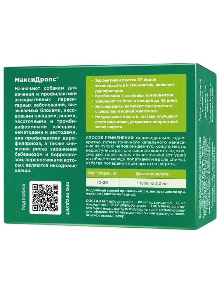 Дропс® назначают взрослым собакам и щенкам для лечения и профилактики ассоциативных паразитарных заболеваний, вызываемых блохами, иксодовыми клещами, вшами, чесоточными и тромбидиформными клещами, нематодами и цестодами, для профилактики дирофиляриоза, вызываемого личинками Dirofilaria immitis и Dirofilaria repens, а также снижения риска заражения бабезиозом и боррелиозом, переносчиками которых являются иксодовые клещи.Макси