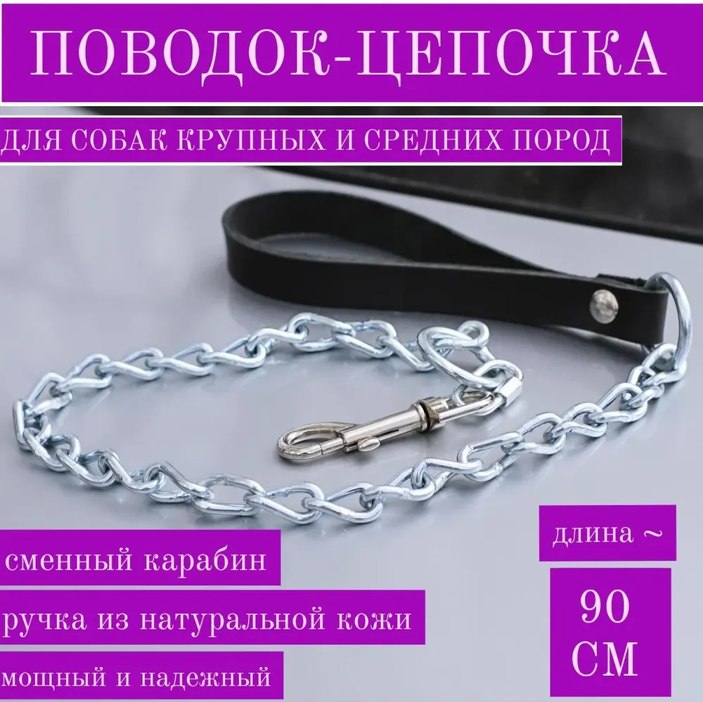 Поводок цепь, для собак средних и крупных пород и щенков крупных пород, 90см.Ручка изготовлена из качественной натуральной кожи. Ширина ручки - 2 см.Толщина цепи - 4 мм, что позволяет удержать даже весьма сильного питомца. Может использоваться, как с ошейником, так и со шлейкой.Крепкая надежная фурнитура. Сменный карабин, что предоставляет возможность поменять его на любой другой, если вдруг Вы посчитаете ,что он слишком мощный или наоборот у Вас будут сомнения о его крепости. также ,эта функция позволяет из поводка, сделать поводок удавку, если снять карабин и соединительный карабин, останется кольцо, в которое продевается цепь и Вы получаете удавку В отличии от других цепей, в этом плюс этого вида поводка.Со временем, так же , карабин может прийти в негодность, а то, что он сменный, Вам даст возможность сменить только карабин, а не приобретать заново новый поводок.Удобно использовать как для повседневной прогулки, так и для пробежки.В комплект к поводку рекомендуем приобрести ошейник из нашего ассортимента.Всегда очень рады и благодарны за Ваши отзывы.