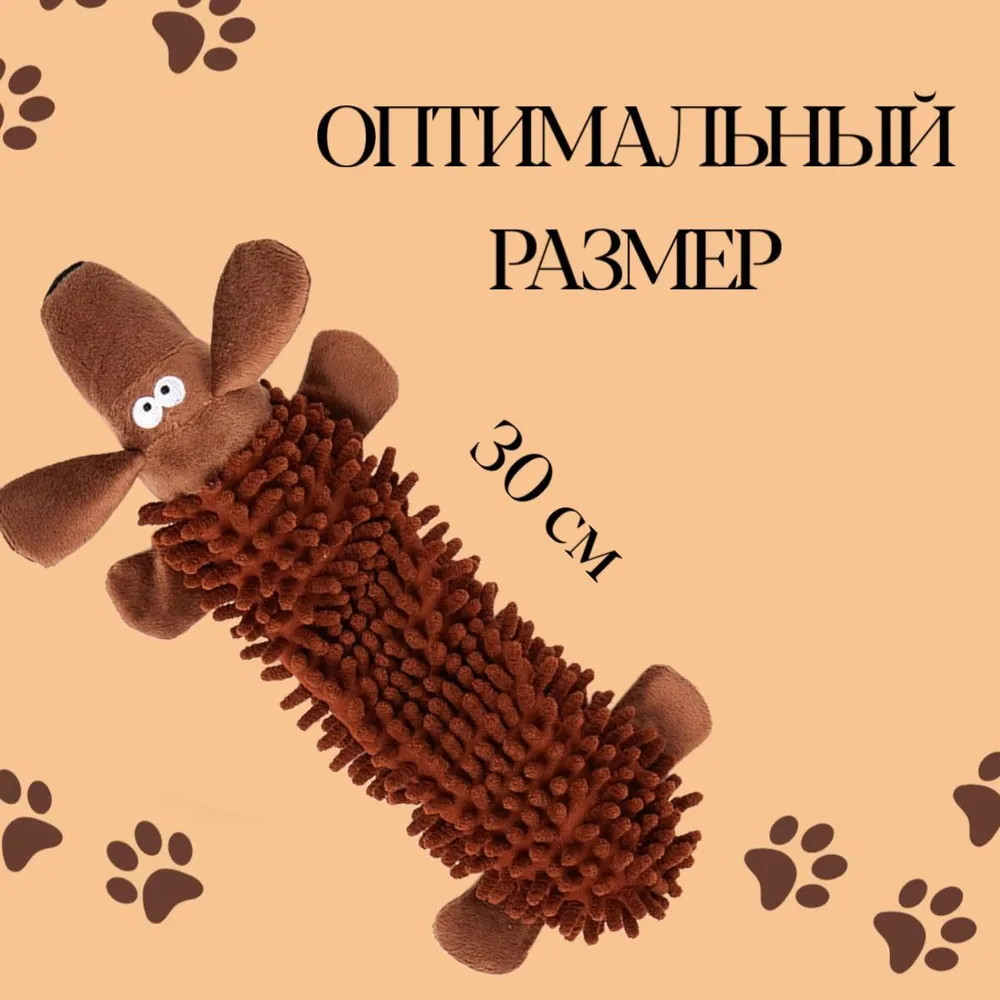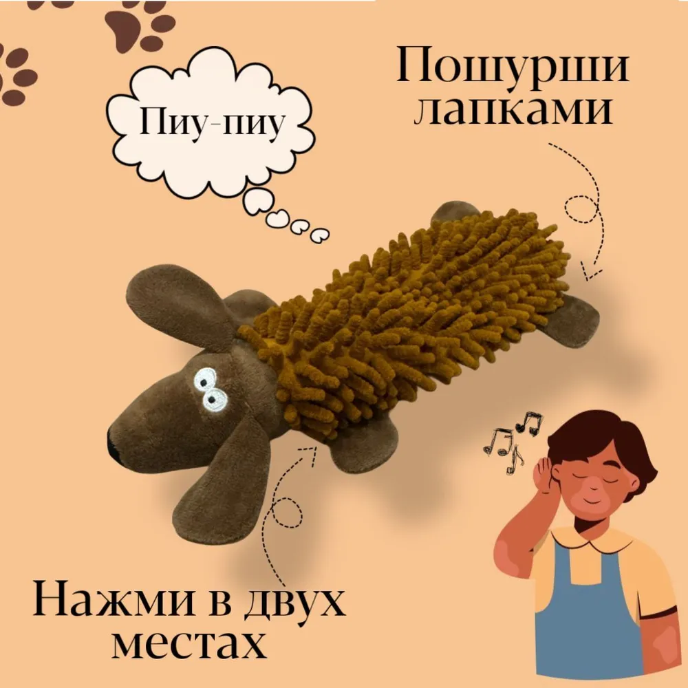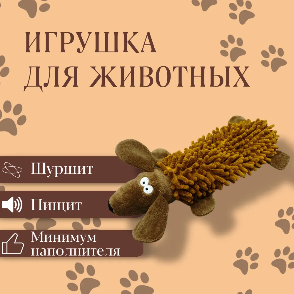 Мягкие игрушки с пищалкой подходят для собак и щенков мелких и средних пород, а также кошек. \n\nЗвуковая игрушка для животных изготовлена из прочного и безопасного материала. Тело из материала в форме лапши. Такая фактура игрушки удобна для укусов даже самых маленьких пород. Если питомец не любит чистить зубы, игрушка поможет, так как происходит естественная чистка зубов. Наполнитель присутствует только в верхней части игрушки, которая трудна для разгрызания. Глаза надежно приклеены.\n\nИгрушка с двумя встроенными звуковыми пищалками отвлекает питомца и пробуждает охотничьи инстинкты. Шуршащие лапки интересуют питомца больше, чем домашние тапочки, диван или ножки стула. Мягкие погрызушки для собак снимают напряжение и успокаивают питомца, а также работают как антистресс для животных.\n\nУход за игрушкой для домашних животных не доставит хлопот. Плюшевую игрушку можно стирать в стиральной машине, пищалка не перестает работать.\n\nНадежная игрушка пищалка для собак подойдет для дрессировки и активных игр дома и на природе. Размер игрушки подойдет для аппортирования. Игрушку можно перетягивать.\n\nМузыкальная игрушка предназначена для мелких и средних пород: шпица, чихуахуа, йоркширского терьера, той-терьера, таксы, пуделя, джек-рассел-терьера, пекинеса, мопса, ши-тцу, французского бульдога, корги и других.\n\nРеалистичная шуршащая игрушка выполнена в форме животных свинья, петух, собака. Можно собрать ферму животных.