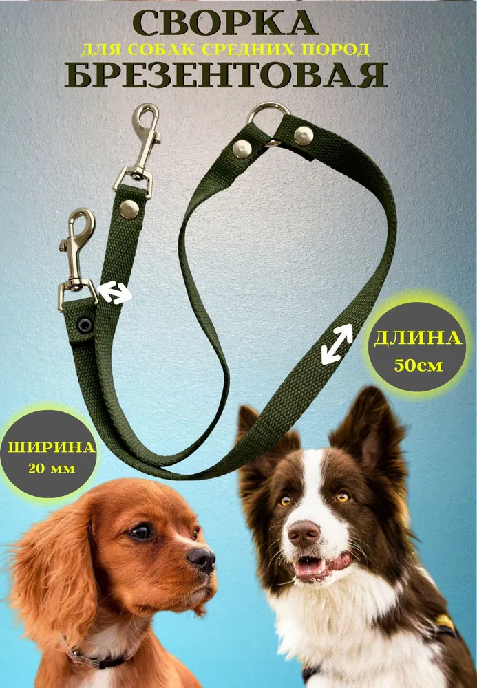 Поводок – сворка / поводок для собак брезентовый 50*2*20 для средних пород. Ширина поводка – 20 мм, длина – 50 см ( каждого поводка), кол-во поводков на кольце – 2Поводок цвета хаки. Поводок-сворка. Поводок для двух собак. Поводок брезентовый для собак средних пород. Поводок предназначен для выгула или дрессировки двух собак одновременно. Поводок сделан из качественного брезента с использованием нейлона. Брезентовый поводок отличается своей прочностью и долговечностью. С одной стороны надежный карабин, который сможет выдержать вес собаки средней породы.. Карабин с вращающимся механизмом, что предотвращает закручивание и запутывание поводка. С другой стороны – кольцо для крепления основного поводка. И карабин, и кольцо закреплены с помощью клепок, что гарантирует надежность соединения.Страна производитель – Россия.