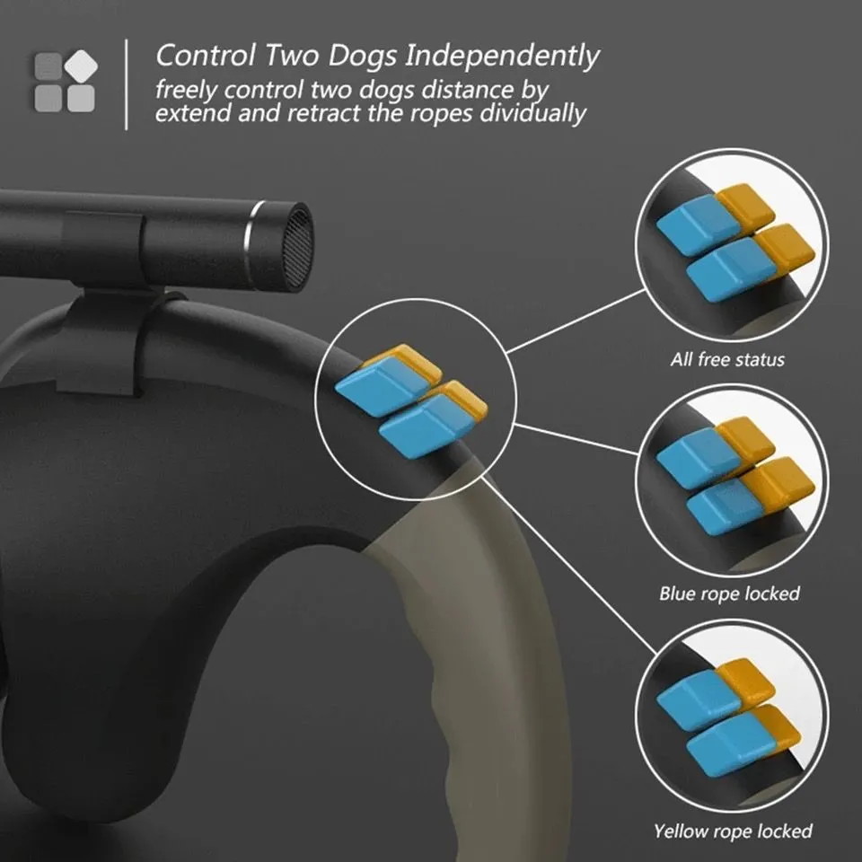 Отличный подарок владельцу 2х собак!Рекомендуется для собак весом больше 6 кг. Рулетка для 2х собак сильно облегчает жизнь владельцам собак. Позволяет владельцу одновременно контролировать двух питомцев на прогулке. ПРЕИМУЩЕСТВА: Основное преимущество рулетки заключается в том, что она позволяет держать каждую собаку на отдельном поводке и предотвращает спутывание. Вторая рука всегда свободна.Поворот на 360. LED-фонарик