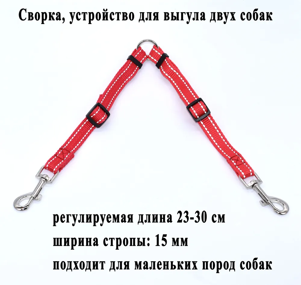 Сворка, устройство для выгула двух собак на одном поводке.Данная сворка выполнена из светоотражающей стропы, прочных пластиковых пряжек для регулировки длины и качественных металлических карабинов.Сворка имеет металлическое сварное кольцо, за которое цепляется сам поводок.Размеры:длина 23-30см ширина строп 15мм для собак до 15кг. Размер карабина 7смдлина 30-40см ширина строп 20мм для собак до 30кг, Размер карабина 8смдлина 35-45см ширина строп 25мм для собак до 50кг. Размер карабина 8,5см