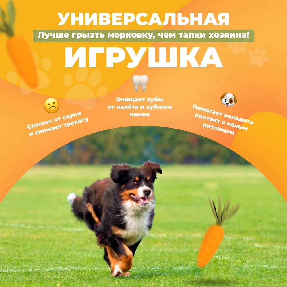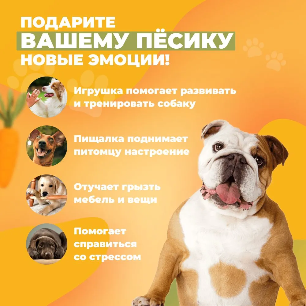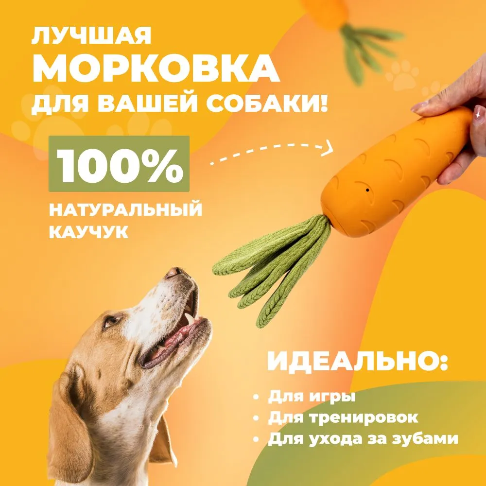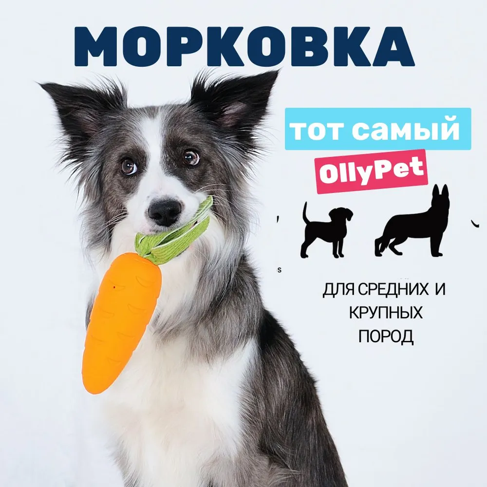 Прочная игрушка для собак крупных пород и активных щенков средних размеров. OllyPet “Морковка” — это интерактивная игрушка с пищалкой, шуршащими листочками, удобной формой для жевания и безопасным материалом. Если вы ищете игрушки для крупных собак, которые выдерживают грызение, апорт и погрызушки — попробуйте эту яркую морковку. Изготовлена из натурального каучука, без латекса. Подходит как для игры на улице, так и для домашних развлечений. Отличная альтернатива мячику, кусалке, грызунку или игрушке Kong / Конг.Подходит для овчарки, лабрадора, питбуля, корги, а также как одна из лучших игрушек для щенков крупных пород. Помогает снять стресс, отвлечь от мебели, массирует дёсны и поддерживает здоровье зубов. Надёжный выбор среди зоотоваров для собак всех размеров и пород.Преимущества:— Прочная и долговечная— Для крупных и средних пород— С пищалкой и шуршащими листочками— Устойчива к грызению и агрессивным жевателям— Безопасная, каучуковая, без латекса— Идеальна для жевания, прогулок, апорта, дрессировки