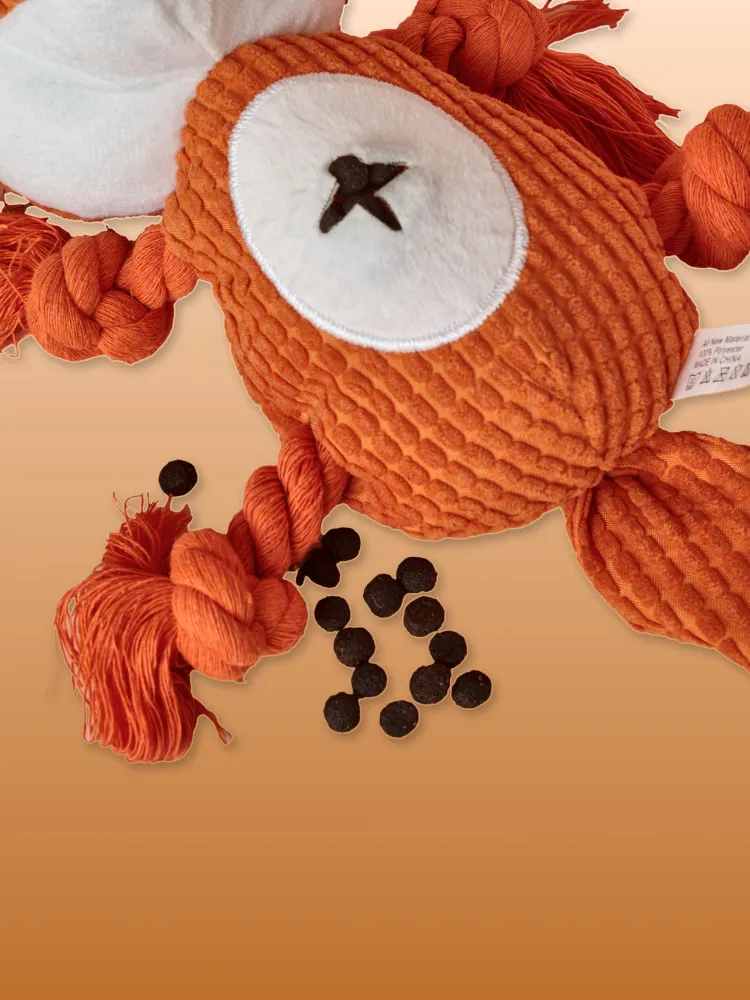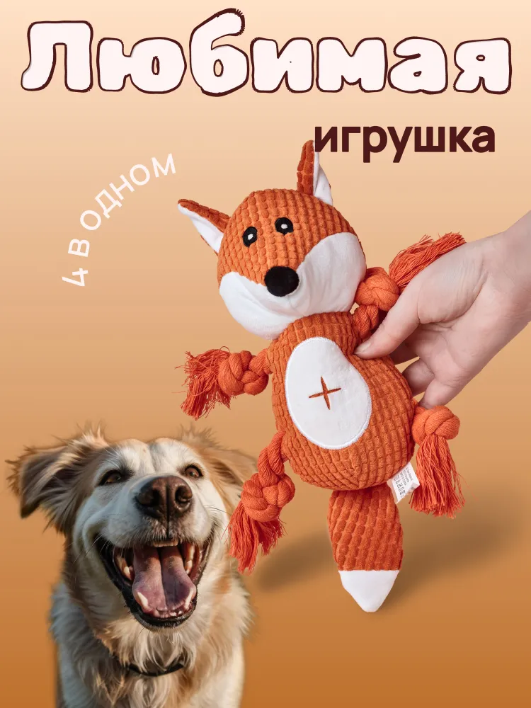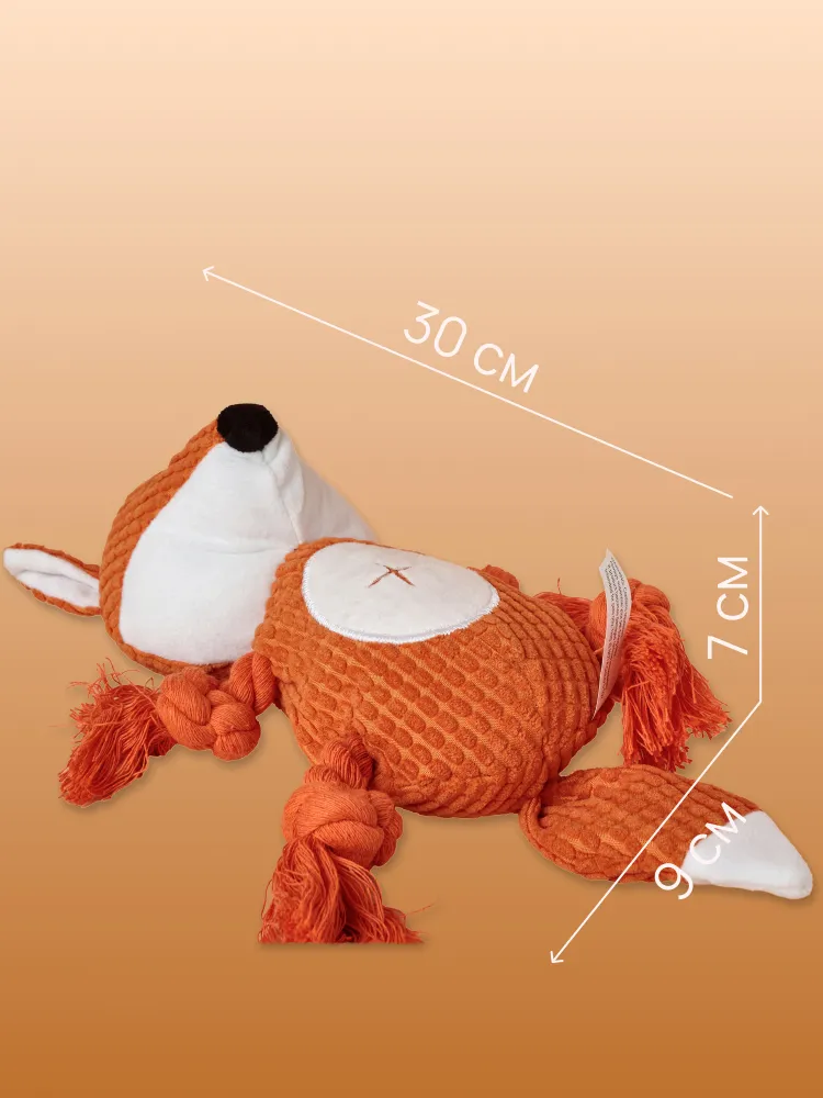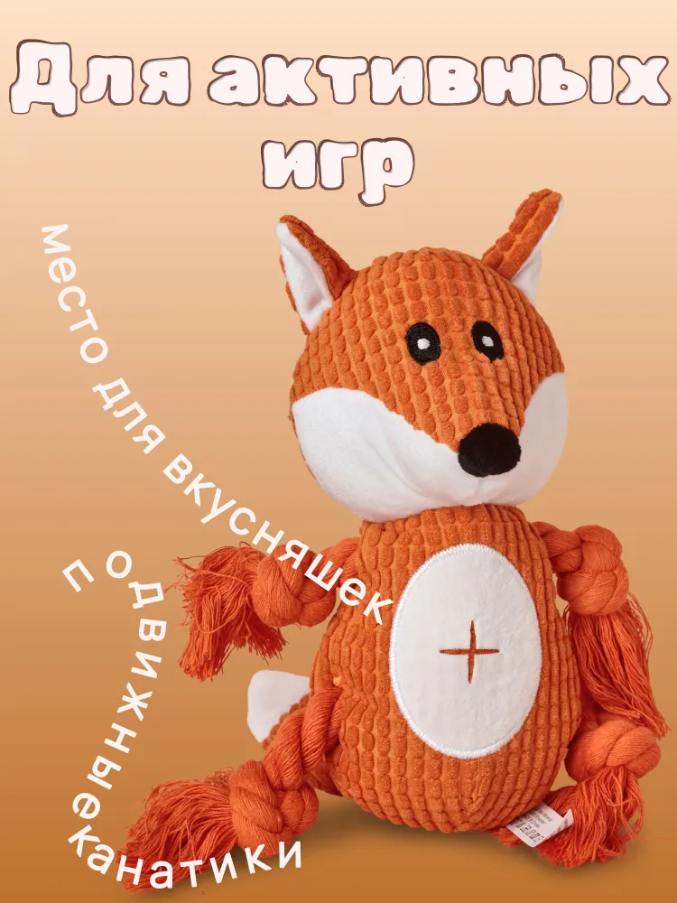 Интерактивная звуковая игрушка для собак плюшевая Лиса!На ощупь это приятный и прочный материал, в тельце Лисы встроена пищалка, а в хвосте вшит шуршащий материал, который займет вашего четвероногого друга. Ножки представляют собой веревки - канатики, поэтому Лиса также подойдет для активных игр, как дома, так и на улице, например, можно играть вместе с хозяином в перетяжки. У большинства собачек эта игрушка становится самой любимой. Ее можно взять в подарок вашим друзьям-собачникам, т.к. игрушка идет в красивой прочной упаковке.Особенности:В животе есть небольшое отверстие для лакомства, куда можно положить сухой собачий корм, домашних питомцев это еще больше привлекает во время игры с игрушкой. Также есть пищалка в желудке и погремушка в хвосте. Тканевая подкладка: нейлоновая подкладка, двухслойная ткань, более прочная и устойчивая к укусам.В целом, это крепкая канатная собачья игрушка грейфер – тянучка (кусака), в которой есть пищалка, шуршалка и канаты. Некоторые покупатели берут эту умную игрушку для шиншилл, хорька , енот, но она больше подходит для собак не больших размеров (таких пород, как йорк, шпиц, чихуахуа, корги. лабрадор, джек рассел, такса, мопс, фокс терьер и др.).