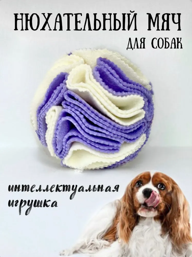 Нюхательная игрушка мячик направлен развлекать и развивать логику питомца. Диаметр шара 15 сантиметров (см). В складки шара закладываются кусочки любимого лакомства или корма, которые собака должна найти. Такой нюхательный мяч продлит время кормления животного. Игрушка отлично подходит для игр, дрессировки любимого питомца. Игры с мячом развивают нюх и мышление, улучшает концентрацию внимания, снижается стресс и тревожность. Мяч содержит большое количество слоев, что способствует увлекательному времяпрепровождению. Важное в использовании: хозяину нужно контролировать процесс игры, не давать собаке брать шар в пасть или трепать его и не допускать любого агрессивного воздействия на игрушку. Не является антивандальной. Перед началом использования расправьте все складки ткани для увеличения объема мячика. Для первого раза выбирайте очень вкусное и самое любимое лакомство и кладите его на поверхность складок. Чтобы показать принцип игры. Шар как головоломка развивает нюхательный навык собаки. Так же собаке приходится соображать и думать, у нее расходуется энергия. Та лишняя, которая идет на разрушение вашего дома, особенно если собака щенок или молодая. По нагрузке на мозг 15 минут игры в шар равняется 45 минутам прогулки на улице. Такие товары для животных вы с удовольствием можете использовать как дома так и на даче, в дороге, дальней поездке. Они отлично подойдут и будут удобны в применении для собак мелких пород, средних пород, крупных пород. Зачем собакам вообще нужны игрушки? Нюхательные шары, нюхательный коврик, лизательный коврик и другие игрушки для питомцев способствуют физическому и умственному развитию животных. Их можно использовать в процессе активных игр на природе при выгуле пса. Существует много вариантов для игр с собакой и игрушками.