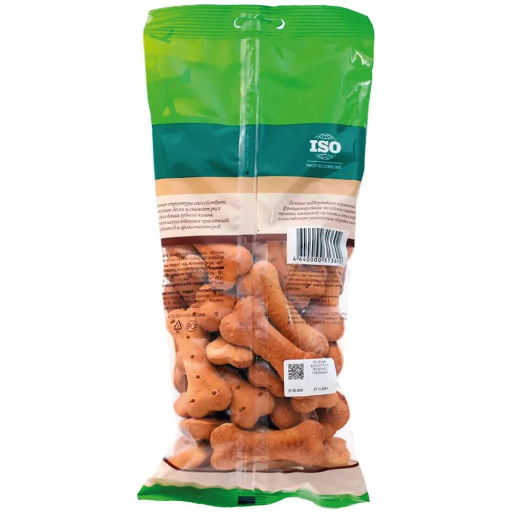Витамины A, B2, B5, B9, B12, B 15, D, E, PP, N, входящие в состав печенья, участвуют в жизненно важных процессах организма: обмене веществ, в тканевом обмене, влияют на функцию печени, участвуют в обмене биологически активных веществ и гормонов, в синтезе аминокислот и белков, препятствуют развитию анемии. Также они улучшают липидный обмен, усвоение кислорода тканями, нормализуют мышечную деятельность, функцию эндокринной системы, особенно половых и щитовидной желез, гипофиза и влияют на скорость основного обмена. Состав: мука из цельной пшеницы, овсяная крупа, диетический говяжий рубец, растительное масло, печень говяжья, мед, яблочное пюре, постное мясо говядины, молотая гвоздика.\nКаждый ответственный владелец четвероногого друга знает, как важно подобрать правильный корм и лакомства для своей собаки. И если основной корм удовлетворяет потребности в питании животного, то лакомства чаще всего используют для дрессировки собак или в качестве дополнительного угощения.\nНа рынке представлено огромное количество самых разнообразных лакомств, среди которых можно выделить наиболее популярные:\nСушеные лакомства для собак представляют собой субпродукты, обработанные по специальной технологии, которая позволяет сохранять все полезные вещества. В ассортименте можно найти бычий корень, легкое говяжье, рубец, трахея и другие варианты.\nЖевательные лакомства — палочки, снеки и колбаски подойдут для собак любых пород и возрастов. К тому же именно этот вид «погрызушек» способствует очистке зубов: в процессе механически удаляется налет и выделяется много слюны. Особенно полезны эти вкусняшки для щенков в период смены зубов: малыши так или иначе будут что-то грызть, поэтому лучше использовать для удовлетворения этой потребности специальные лакомства.\nСублимированные — натуральные лакомства из мясных продуктов, произведенные путем низкотемпературной обработки. Удобны в использовании: как правило, эти лакомства нарезаны на маленькие кусочки, которые удобно подавать собаке. \n\n\nСтоит уделить внимание подбору лакомств в соответствии с размером питомца:\n\nДля собак крупных пород лучше выбирать менее калорийные лакомства достаточно большого размера.\nЛакомства для собак мелких пород нужно подбирать с учетом размера пасти животного — это могут быть вкусняшки небольших размеров или же мелко нарезанные дольки. Для щенков мелких пород также будут полезны желатиновые лакомства, которые помогут облегчить зуд в деснах. \nДля собак средних пород подобрать лакомство немного проще — главное, не забыть учесть особенности организма собаки.\nКак правило, производители маркируют свою продукцию, поэтому найти подходящий вариант не составит труда.\nЛакомства для животных — то же самое, что и десерт для людей, поэтому очень важно не переборщить с этим: ежедневная порция должна составлять не более 10% от основного рациона. К тому же, собачьи лакомства могут дополнять сухой корм — например, если подобрать вкусняшки с добавлением витаминов и минералов, которых не хватает в основном питании.